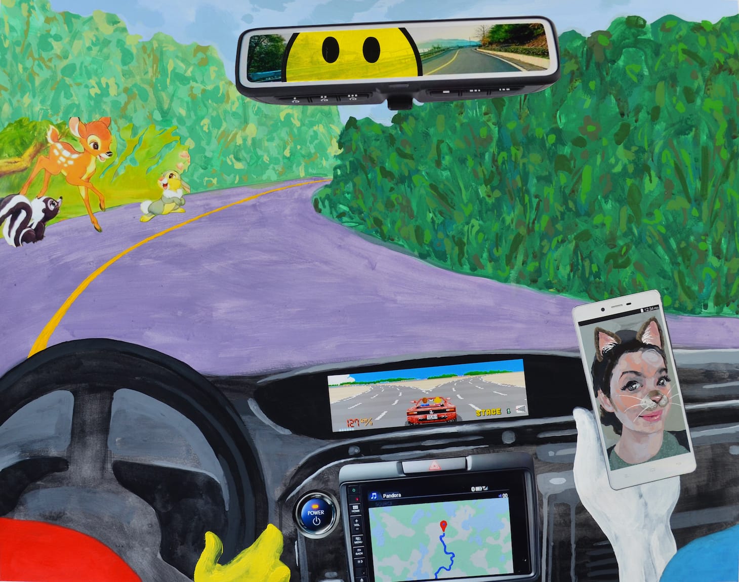 Another striking thing about these works is the attention Gu pays to every part of the composition, from the perspective looking into the scene to the collaged materials. There is an unnerving dissonance to the collaged elements he disperses within his works. In “The Scenic Route” (2019), the view is a car's front windshield and the road ahead, as seen from someone behind the two people seated in the front of the car, and only partially visible to the viewer. Why do we see the eyes of a smiley face in the rearview mirror? Is this a stand in for the emasculated Asian male, all of whom presumably look alike? What are the three Disney animals doing by the side of the two-lane road? What should we make of the face of a young woman with cat ears, nose, and whiskers on the cell phone held by the front-seat passenger?