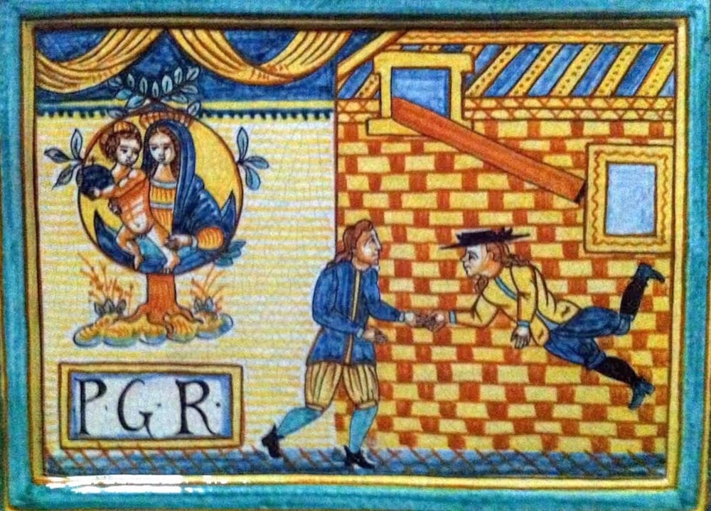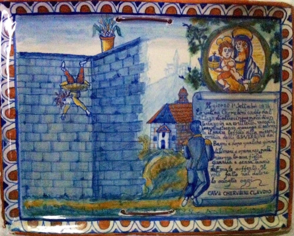 Recounting innumerable perils in image and text, from falling out of a building, boat, or infant’s car seat, to falling off a horse or a Vespa, the ceramic panels curve around arches, climb over doors and windows, and march along columns and corridors. . A few panels are whimsical, although I doubt that was what the craftsmen who created them intended. There are both elegant and clumsy illustrations, ranging from sketchy to intricately detailed, from down-home to sophisticated. All of this is set within an overarching thematic thrust: calamity, with an undercurrent of gratitude . . . or the other way around, depending on where you’re coming from.