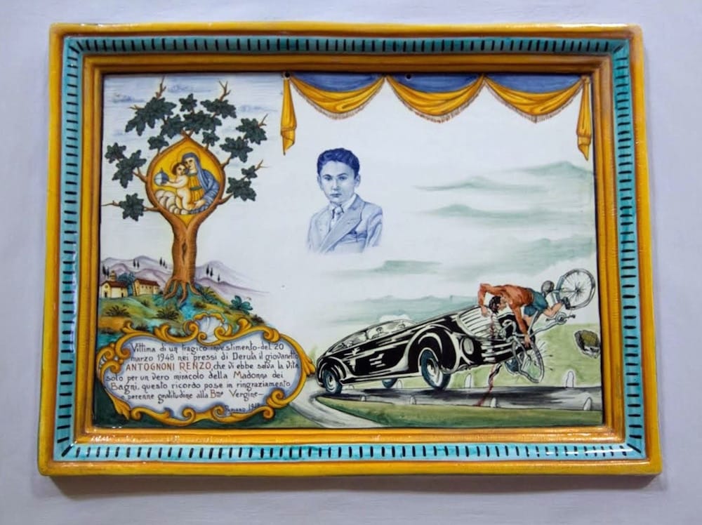 Years later, with his wife deathly ill, this same merchant returned to that same site and prayed to that same Madonna image for his wife’s recovery. Sure enough, upon his return home shortly thereafter, he found her busy with housework . . . cured! Word spread, and ever since, local residents have been commissioning these relatively same-sized “ex-voto” tiles after surviving surgery, robbery, drowning, concentration camp internment, demonic possession, car crash, bull bite, dog bite — you name it — as thanks to the Virgin Mary for what they considered miracles performed.