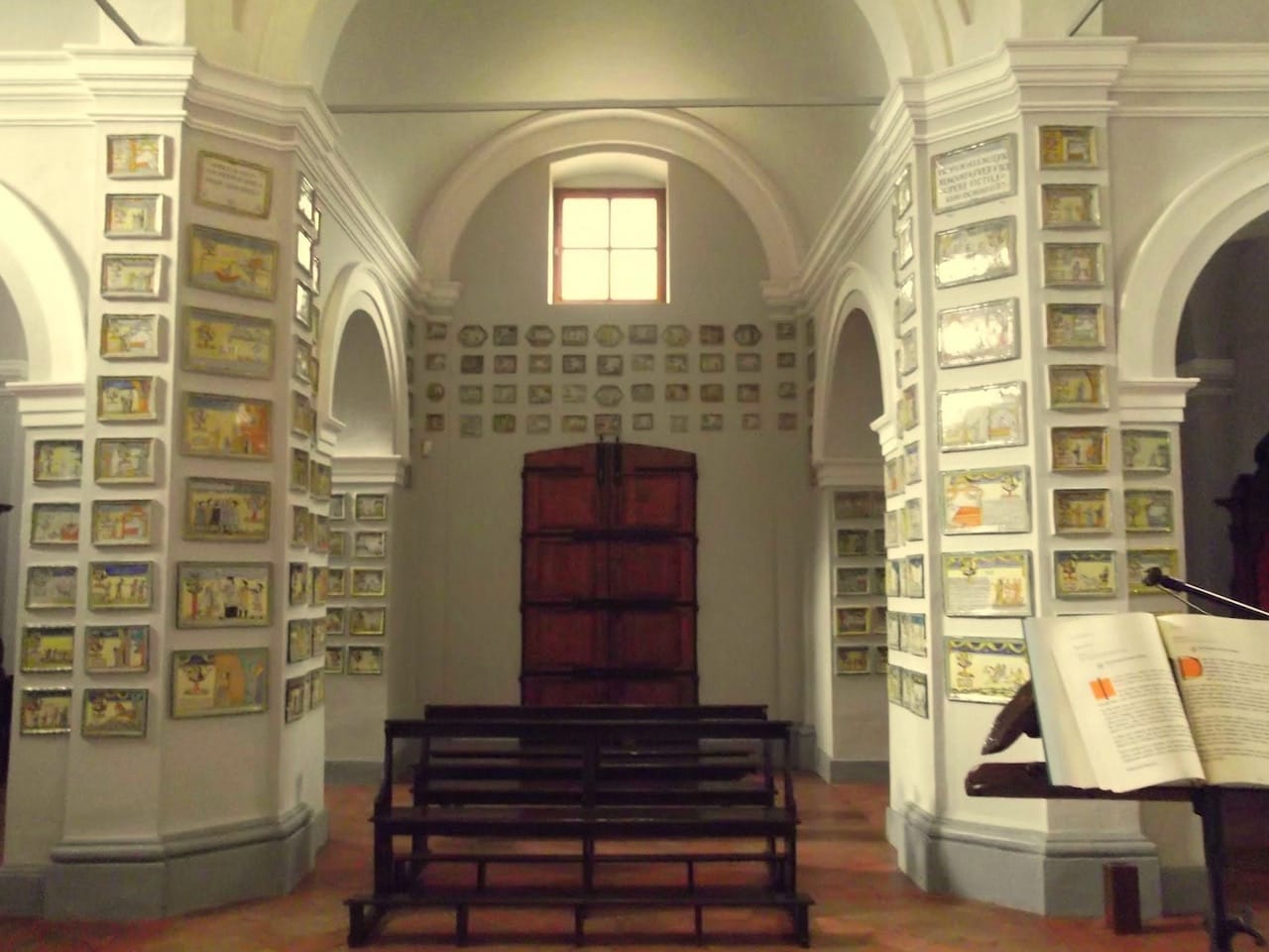 Difficult stories simply told, the church’s painted terracottas are well done, but the overall spirit, combination of tales, and decorative nature of the place are better. Not one inning or nine: extra, extra innings. Modest, charming, and surprisingly upbeat, this graveless cemetery filled with nameless headstones that celebrate survival is an up-close, heartfelt, brilliant yet somewhat dumbed-down dollhouse version of far more famous, masterly, and sublime Italian panel-added-to-panel-added-to-panel efforts. Madonna dei Bagni dwindles if compared to the Giotto-filled (Upper) Basilica of St. Francis of Assisi or Michelangelo’s frescoes on the ceiling of the Sistine Chapel. But that’s okay; it’s healthy for art to flex its muscles in both grand and subtle ways, causing art lovers to flex their eyes, minds, and hearts accordingly.