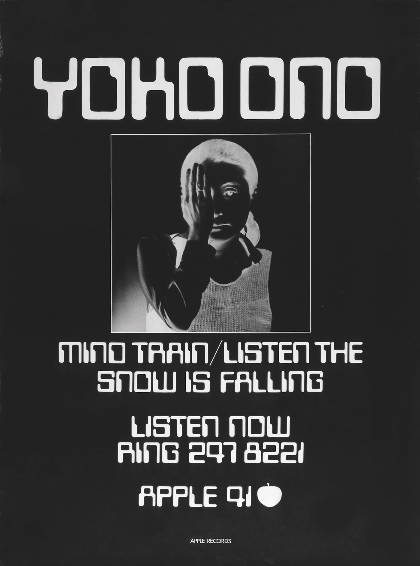 Apple Records advertisement for Yoko Ono’s single, “Mindtrain,” from the album “Fly,” 1971 (photo in poster by Iain Macmillian; photo of poster courtesy of Yoko Ono)