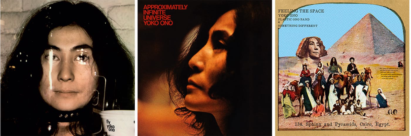 Yoko Ono record-album covers: “Fly,” 1971; “Approximately Infinite Universe,” 1973; and “Feeling The Space,” 1973 (cover photos, left to right: John Lennon, © Yoko Ono; © Bob Gruen; collage photos © Bob Gruen)