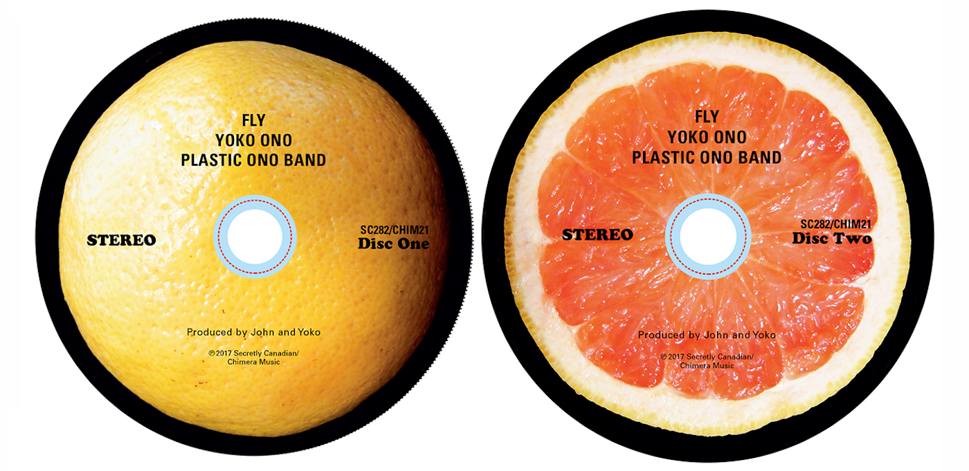 For their joint re-releases of Yoko Ono’s albums, the record companies Secretly Canadian and Chimera Music have created new vinyl-LP and CD labels inspired by Ono’s book, “Grapefruit,” 1964; they recall the fruit-decorated labels of Apple Records, the company that originally issued these recordings (photos courtesy of Secretly Canadian and Chimera Music)