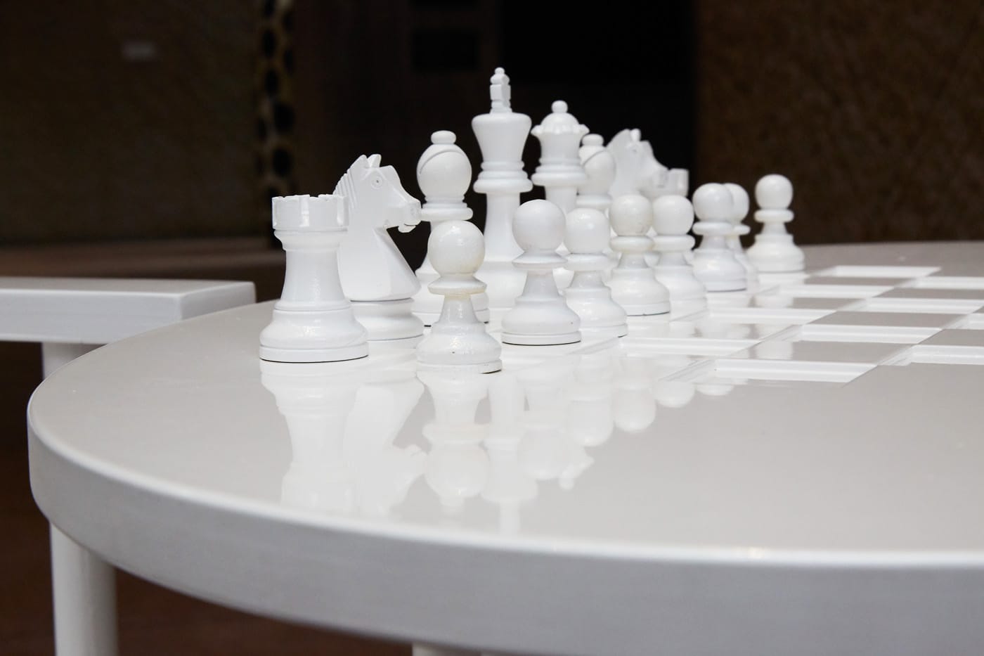 Similarly, “EN TRANCE” (1990/2019), one of the works in Yoko Ono: Remembering the Future, invites visitors to make their way through one of several different openings — a string curtain, a slide leading down to a knee-high hole, a narrow passageway — in order to enter the exhibition’s first gallery. Elsewhere, museumgoers are asked to hammer actual nails into the wooden surface of “Painting to Hammer a Nail” (1961/1966-2019), or to sit down for a game of chess in “Play It By Trust” (1966/2019) — chess boards whose squares and movable pieces are all painted white.