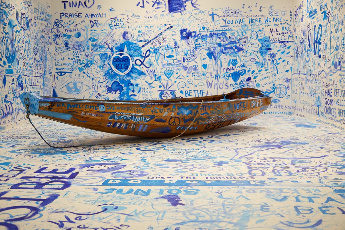 At the Everson, several updated pieces pack a timely punch. “Three Mounds,” which Ono first executed in 1999 using rocks from three towns in Israel, now consists of three piles of brown dirt labeled “Women subjected to domestic violence,” “Women forced into madhouse,” and “Women victims of elder abuse.” “Add Color (Refugee Boat)” has its roots in Ono’s “Add Color Painting,” which she first presented during the winter of 1960-61. Encouraged by its title, visitors to the Everson have covered this participatory work, consisting of an actual rowboat inside an empty space, with doodles and graffiti, many expressing sympathy for the plight of refugees.