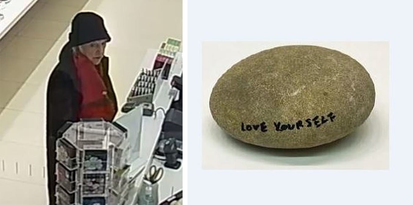 The theft occurred shortly before the museum’s closing time, which may provide a further clue to a motive: perhaps the woman was so taken by the rock’s message, she decided she needed more time to meditate on loving herself.