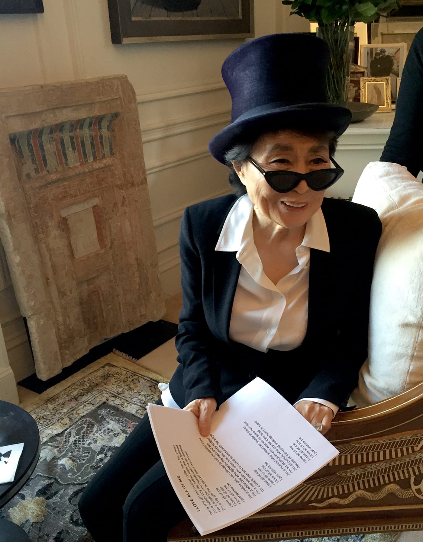 As our conversation shifted back to current events — it took place before Trump’s latest pronouncements against women and a free press; the latest suicide bombing in Afghanistan; and the murder of the Saudi journalist Jamal Khashoggi at Saudi Arabia’s consulate in Istanbul — Ono alluded to such horrific news and the sense of darkness and hopelessness it engenders: “We’re all stuck in it. We’ve got to wake up. It’s terrible, and I’m very sad and angry about it, about grown men who still do not seem to understand that getting money isn’t everything. But still, I understand them. When I say, in one of my songs, ‘I love all of me,’ I’m really talking about loving everyone — and that includes those asses.”
