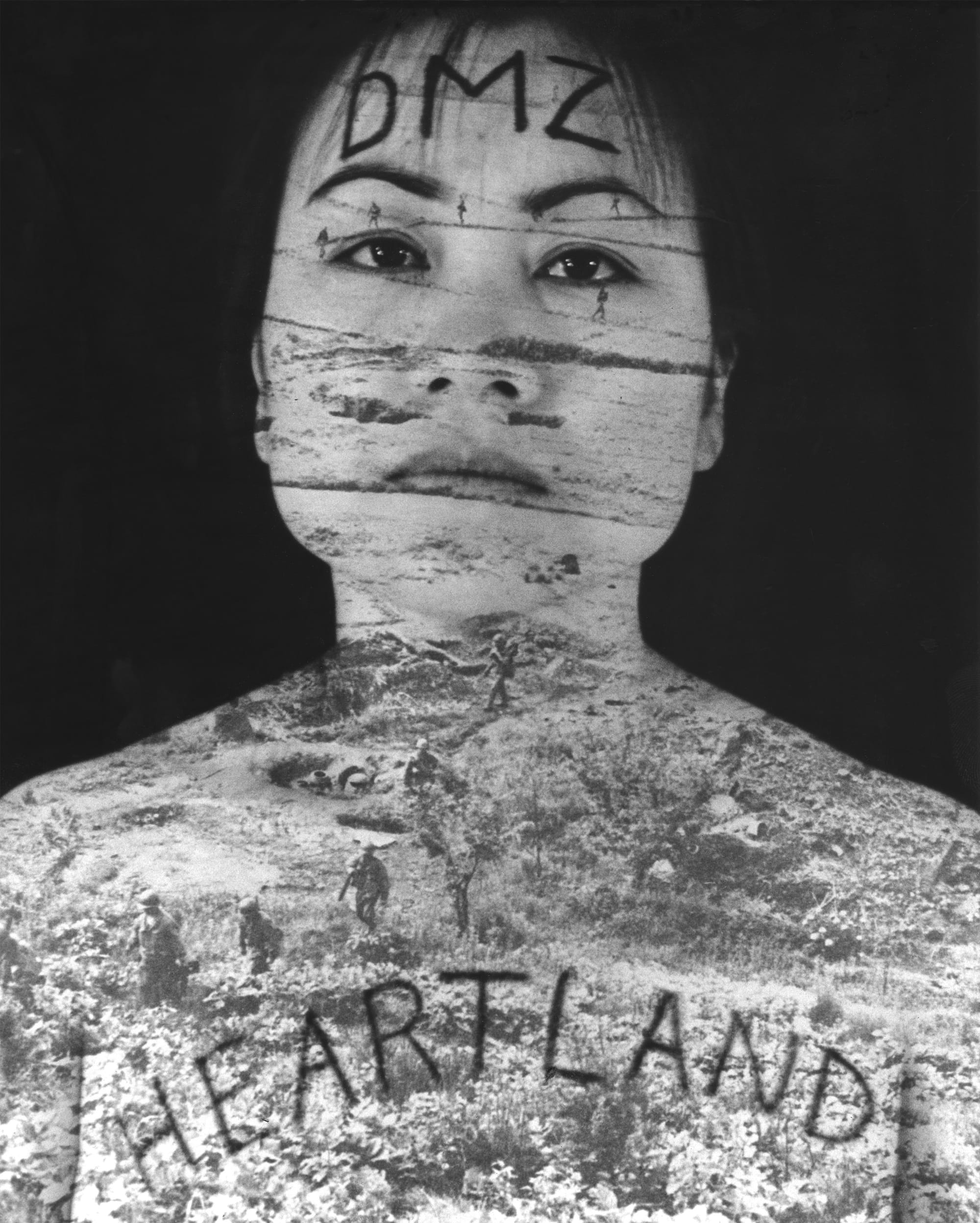 One early series, Make Me (1989), comprises four black-and-white portraits that place Min’s self-manipulated face in direct dialogue with cut-outs of racialized phrases attributed to Asian Americans, such as “model minority” and “objectified other.” Another significant work, Defining Moments (1992), includes six self-portraits overlapped with words and numbers representing historical links to her identity. The series makes references to the 1960 student uprising against the corruption of the first president of South Korea, Syngman Rhee; the 1980 Gwangju Uprising in which military troops killed an estimated 600 to over 1,000 Korean citizens; and the 1992 Los Angeles Riots sparked by Rodney King’s arrest and violent beating by White police officers. Through these interventions, the artist used her gendered body as a declarative site to reclaim the colonization and sexual objectification of Koreans and Korean Americans.