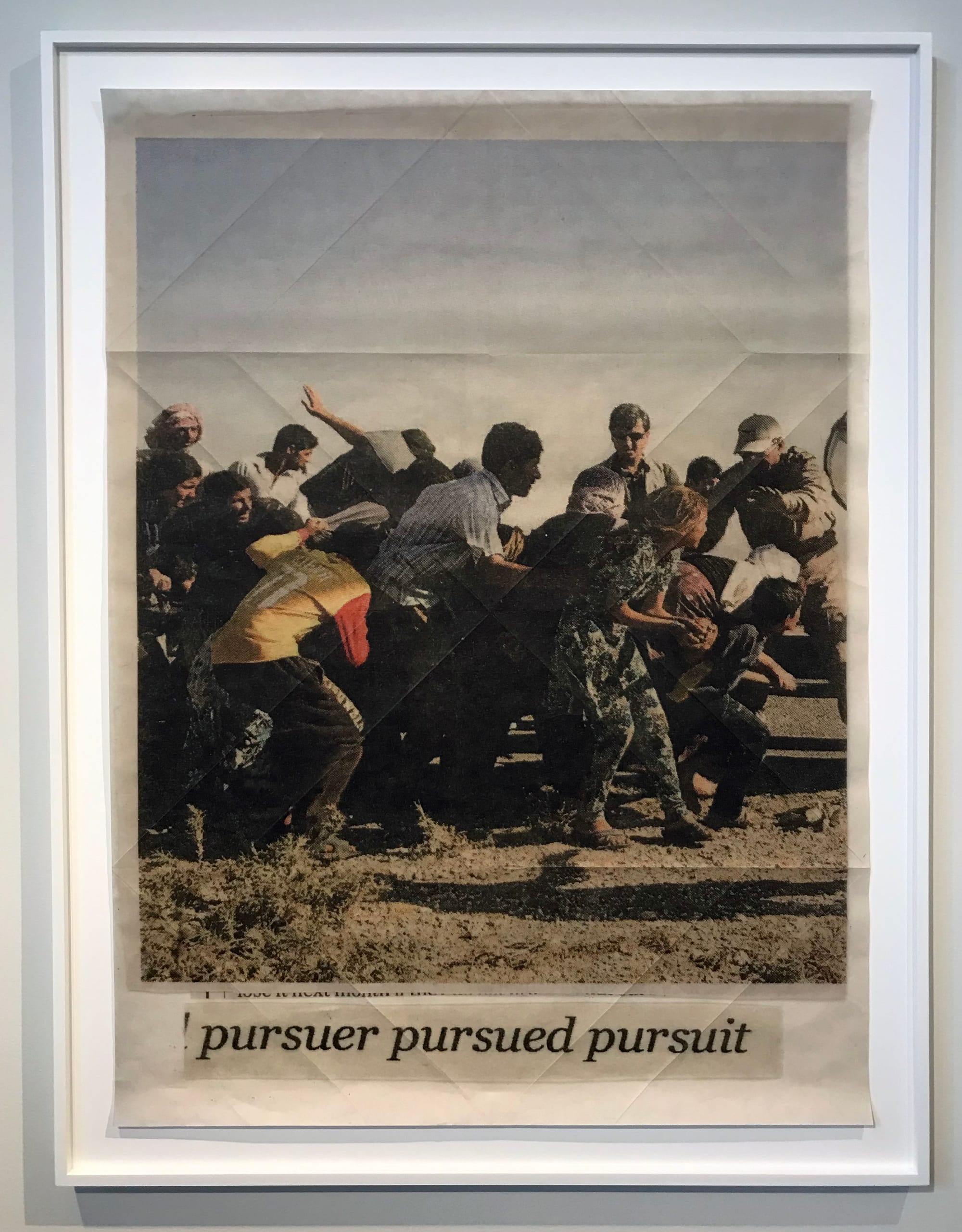 The Signal and the Noise feels like a physical manifestation of the onslaught of information we get every day through newspapers, television, and social media. The types of works neatly framed at OCMA Expand are let loose, duplicated, and strewn about like a ransacked paper press. Each print, the size of standard newspaper but registered on Japanese kozo paper, has two images, each which takes up half a page, and a phrase that unites the two ideas. The papers are folded in half, and without picking them up, it’s difficult to discern which two images are linked together, giving a visitor the opportunity to mix and match the images on their own.
