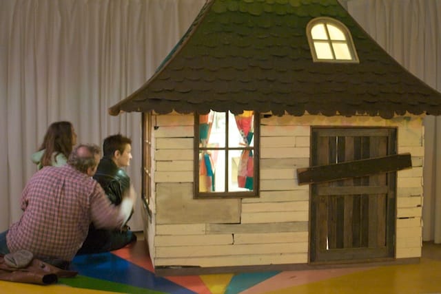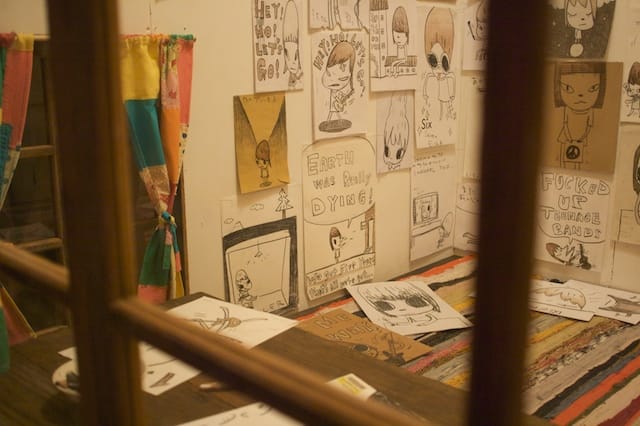 Yoshitomo Nara‘s retrospective Nobody’s Fool at Asia Society is what you would get if art museums loosened up and let themselves have some fun. After climbing the institution’s glassy modern stairs, what greets visitors isn’t a succession of white-walled galleries but a mishmash of wood-walled cubbies and tiny chambers that force participants to kneel down and greet Nara’s drawings, paintings and sculptures on their own terms: close to the floor, like a child exploring a new world. And that’s what Nara’s work is all about: a journey through a world influenced by childhood, small emotions writ large and wonder in hidden corners.