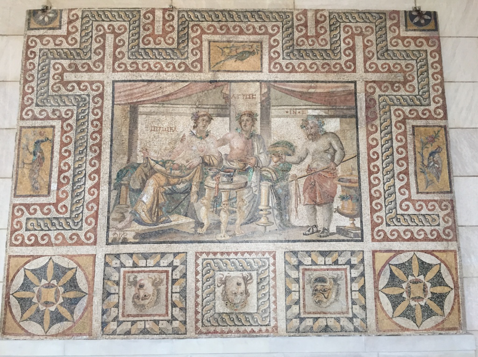 First, as the show’s title indicates, we can think about feasting with the gods. How is food and drink deeply intertwined with religious practice? We can think about this today in light of common religious practices such as Eucharist, an after-church pot luck, Shabbat dinner, or breaking fast with an iftar. The objects collected in the show help us to see even gods engaged in drinking and eating—a mosaic from Antioch, usually in the Worcester Art Museum, shows a drinking contest between the god Dionysus and Herakles.