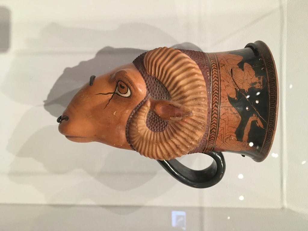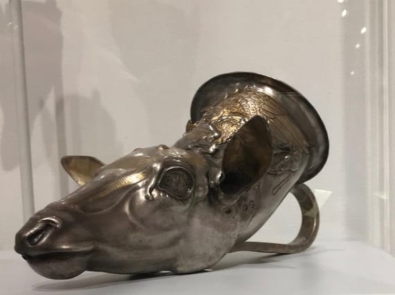 The objects on which the show focuses provoke us to think not only about the line between humans and gods, but also human animals and other animals. As many rhyta were tipped up to the mouth, what another person at table or triclinium would see is an animal face obscuring the face of the drinker: a gazelle, a lion, an ass. The phenomenon is both funny and thought-provoking. What’s the line between the human and other animals? From Roman antiquity, for example, we know the funny story of Lucius being changed into an ass. How do we define humanness? Or, alternatively, how can we be transformed for the better or the worse?