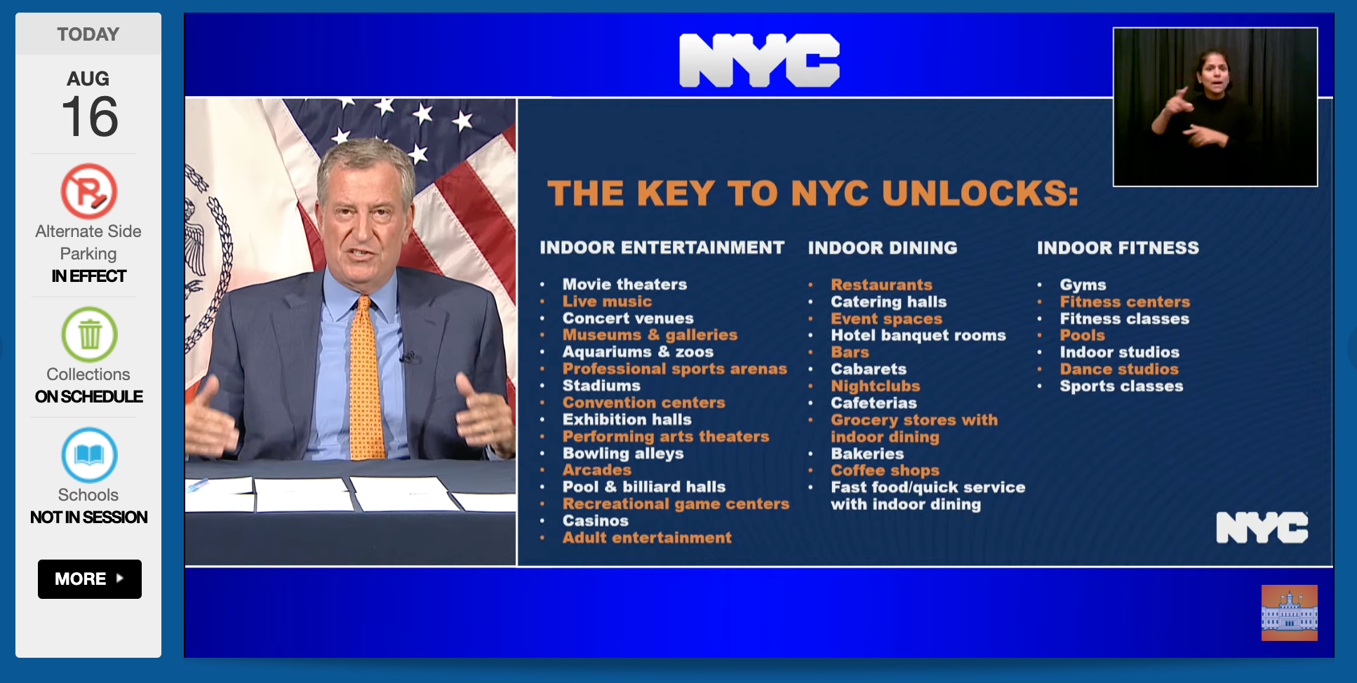 Earlier this month, Mayor Bill de Blasio announced his new “Key to NYC Pass" plan, which will require proof of at least one vaccine dosebefore enteringindoor dining, gyms, and performance venues; in a press conference this morning, he confirmed the city's cultural organizations are also included. The mandate goes into effect today, but will not be enforced with penalties until the week of September 13. Failure to comply with the new policy will result in a $1,000 fine; with each offense, the fee will increase.