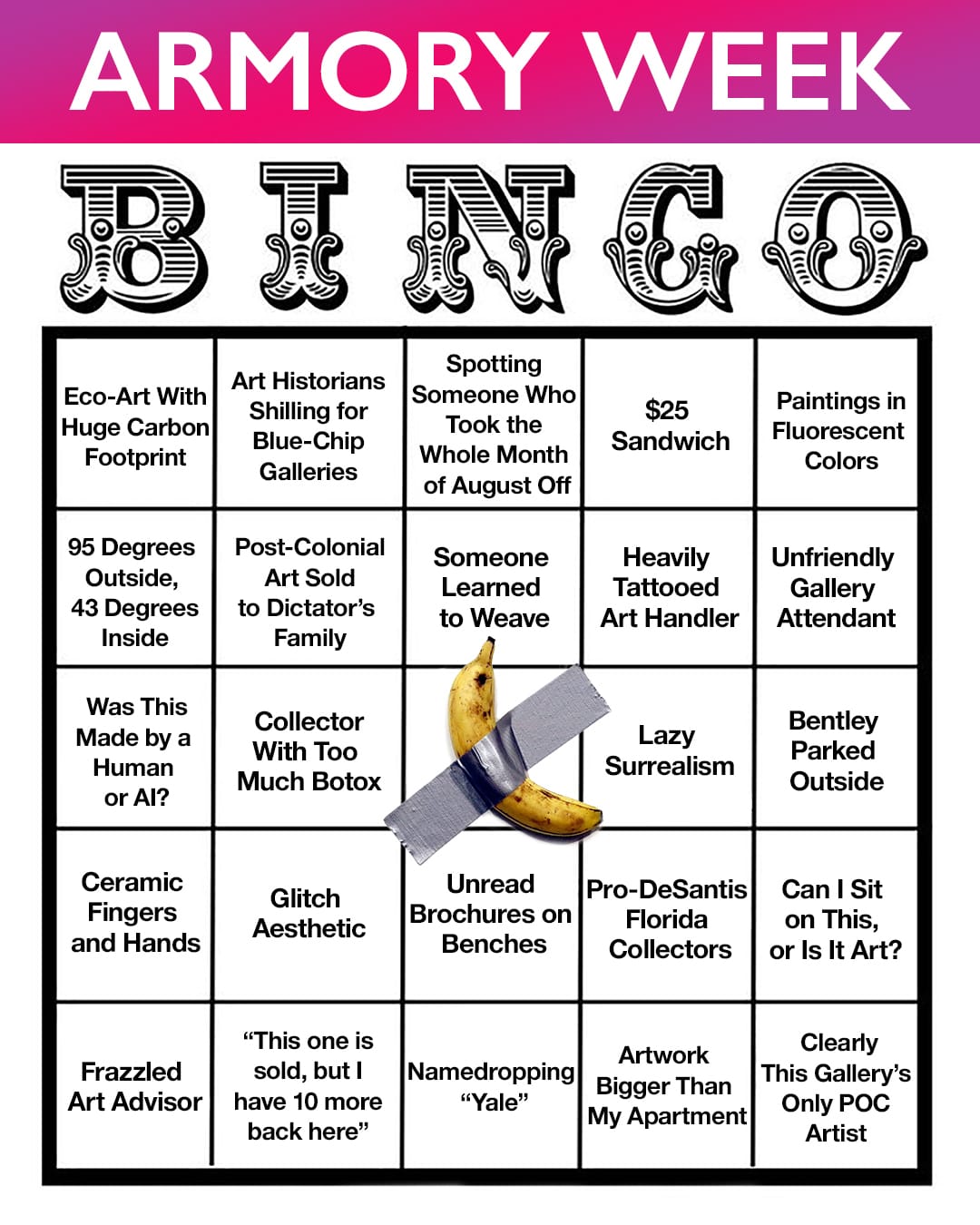 If there’s one thing we can say with certainty about art fairs, it’s that some aspects of them never change. They can scramble the booths, add new sections, or take up roots in a new location altogether, but no matter what, there are a few recurring sights that you’re always bound to come across: the frantic-looking art advisor, for instance, or the infamous $25 sandwich. The latter is a favorite on Hyperallergic’s art fair bingo card, returning this week to help you get through New York Armory Week. It is both a fun game and a handy conversation-ender if you get stuck in a tortuous conversation with that dealer who keeps name-dropping his artist’s Yale MFA … oh hey, BINGO!