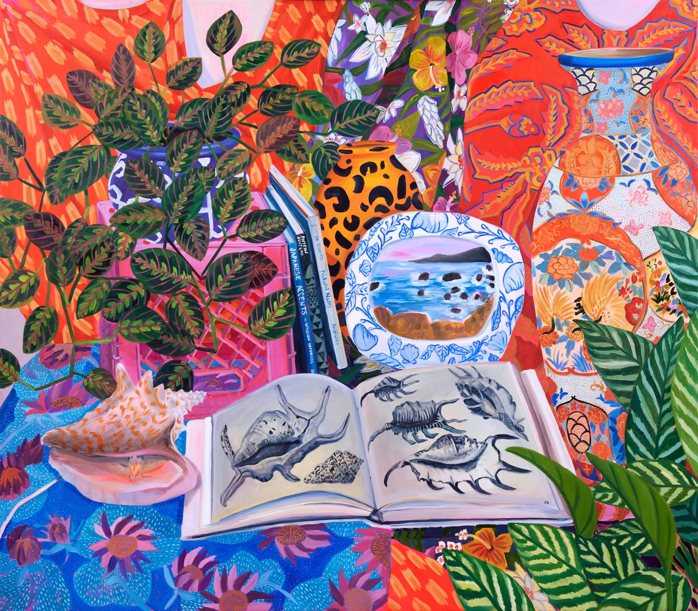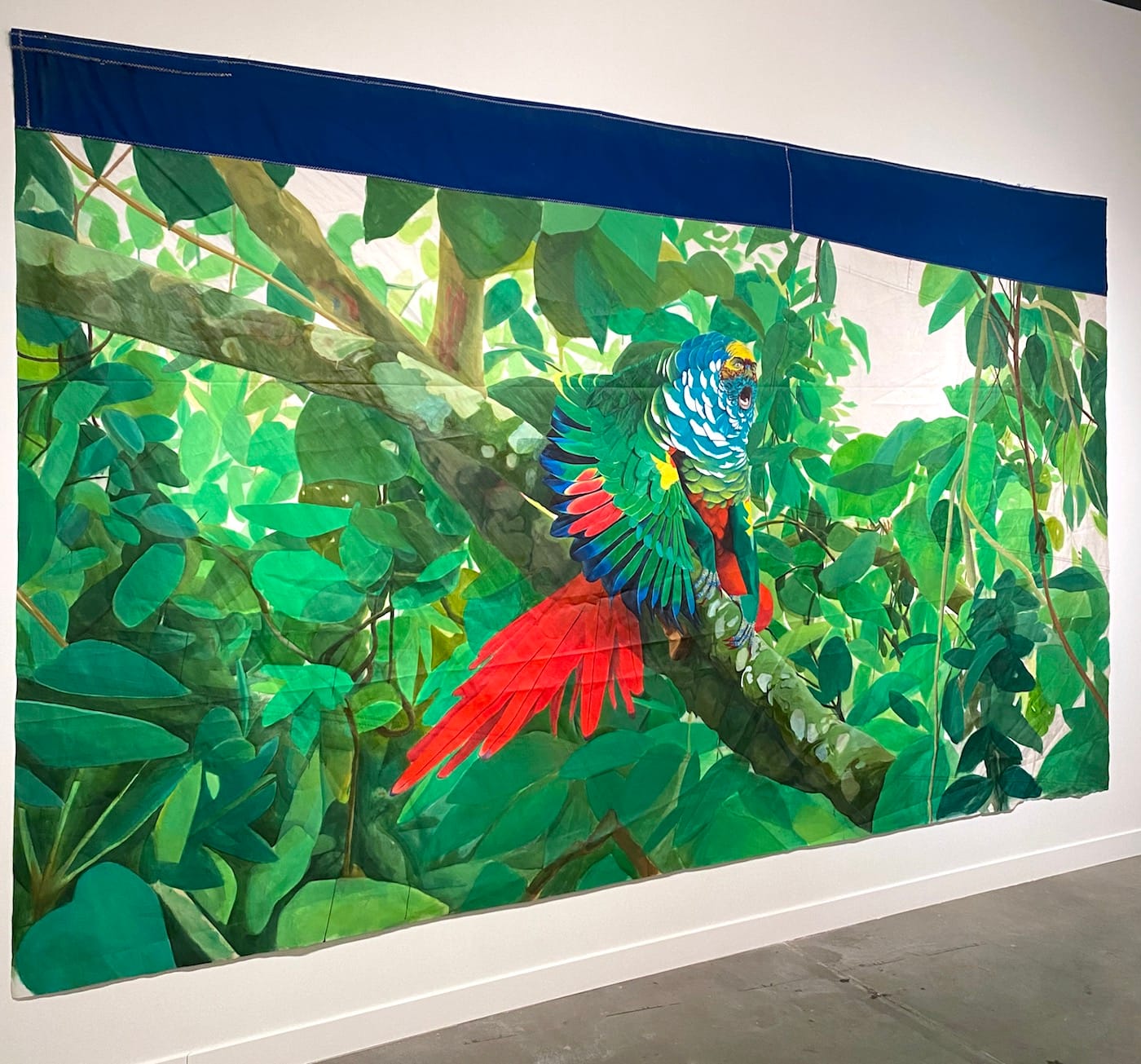 With a style reminiscent of 19th-century naturalist illustrations, Yaron Michael Hakim depicts South American macaws and parrots in their lush jungle environs. Look closer and these hybrid creatures feature human eyes, noses, and mouths that peek out from behind brightly colored plumage. Born in Colombia, Hakim was adopted and raised in a Jewish family, growing up in Australia, Europe, and the US. Painted on Dacron sails — referencing his peripatetic journey — his exquisite paintings capture his fragmented and layered identity with pathos and curiosity. Ocarinas modeled on the artist’s nose question physical stereotypes, interjecting a note of humor into his reflections on selfhood.