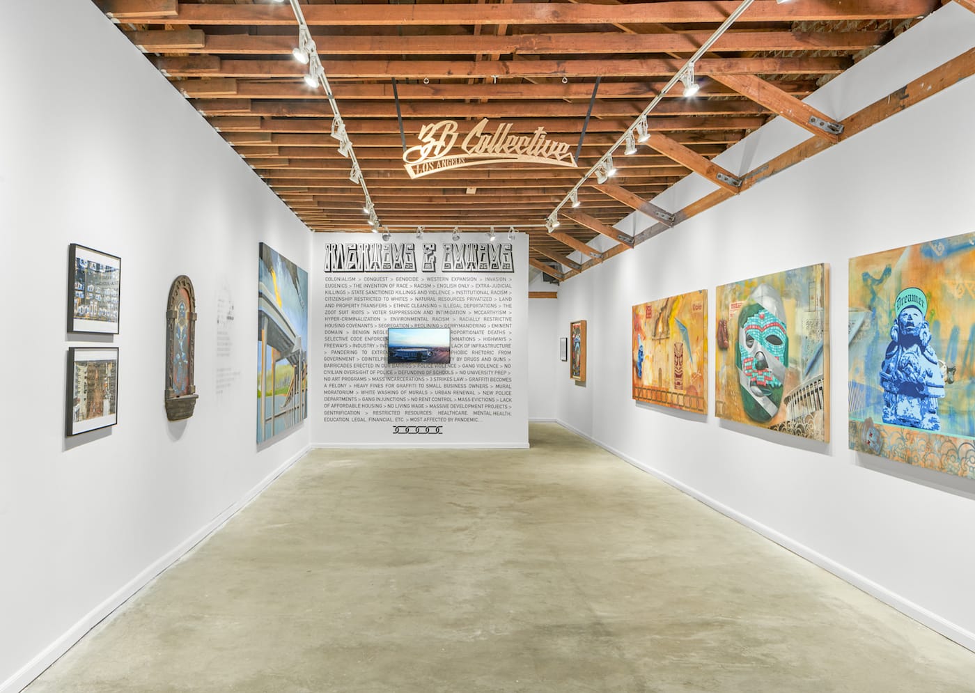 The LA-based 3B Collective is a group of artists hailing from indigenous and immigrant backgrounds who collaborate with institutions and other artists to create murals and public artworks. For Highways & Byways, the group looks at the links between urban renewal, large infrastructure projects, and gentrification, specifically as they affect BIPOC communities. Through mixed-media assemblages, painting, and photography, their works draw a link between earlier periods of colonialism and disenfranchisement, and the reshaping of LA by developers and civic leaders taking place today.