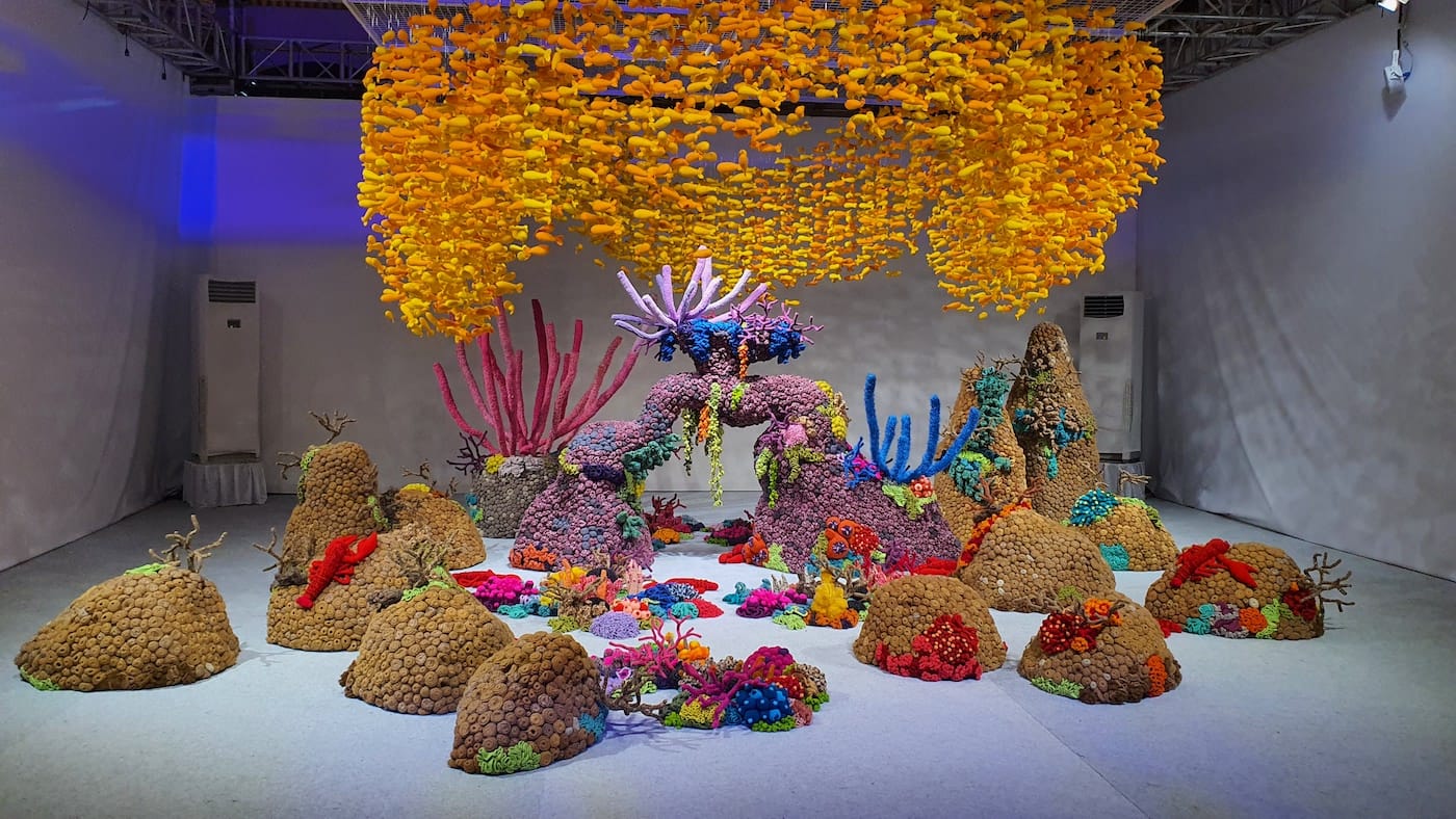 With his immersive installations made from knit and crocheted objects, Indonesian artist Mulyana gives intimate hand-craft a monumental spin. For Modular Utopia, his first solo show in LA, he continues his explorations of undersea environments that are shaped by his own personal mythology and Indonesian folk traditions and costumes. He fills his tableaux with imaginary creatures alongside depictions of a full-sized whale skeleton and dying coral reefs, mixing fantasy with the realities of fragile marine ecosystems.