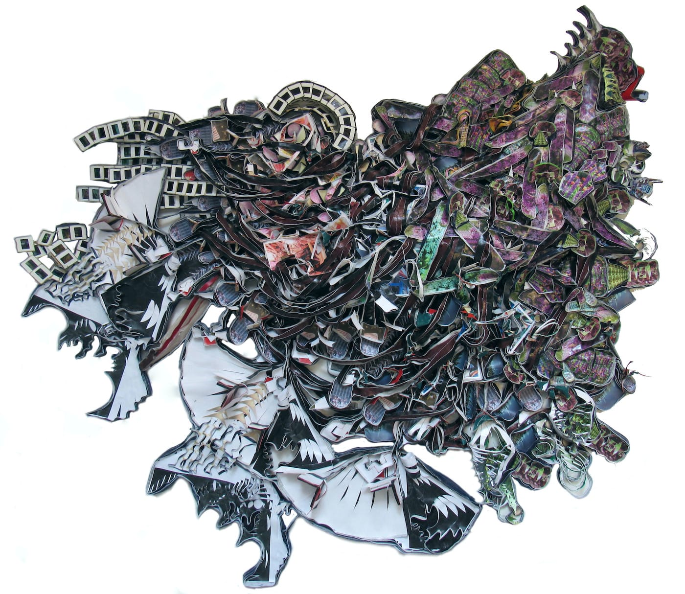 Alicia Piller’s awe-inspiring sculptures give the impression of everyday material run amok, threatening to expand and overwhelm us like a mutant mycological strain. Her constructions incorporate xeroxed photos, found objects, and dried plants, with resin and latex, creating forms that are alien on the macro level but familiar up close. Within is her first solo museum exhibition, a site-specific installation curated by jill moniz that zooms between geological vastness and biological minutiae to bring forgotten histories into sharp focus.