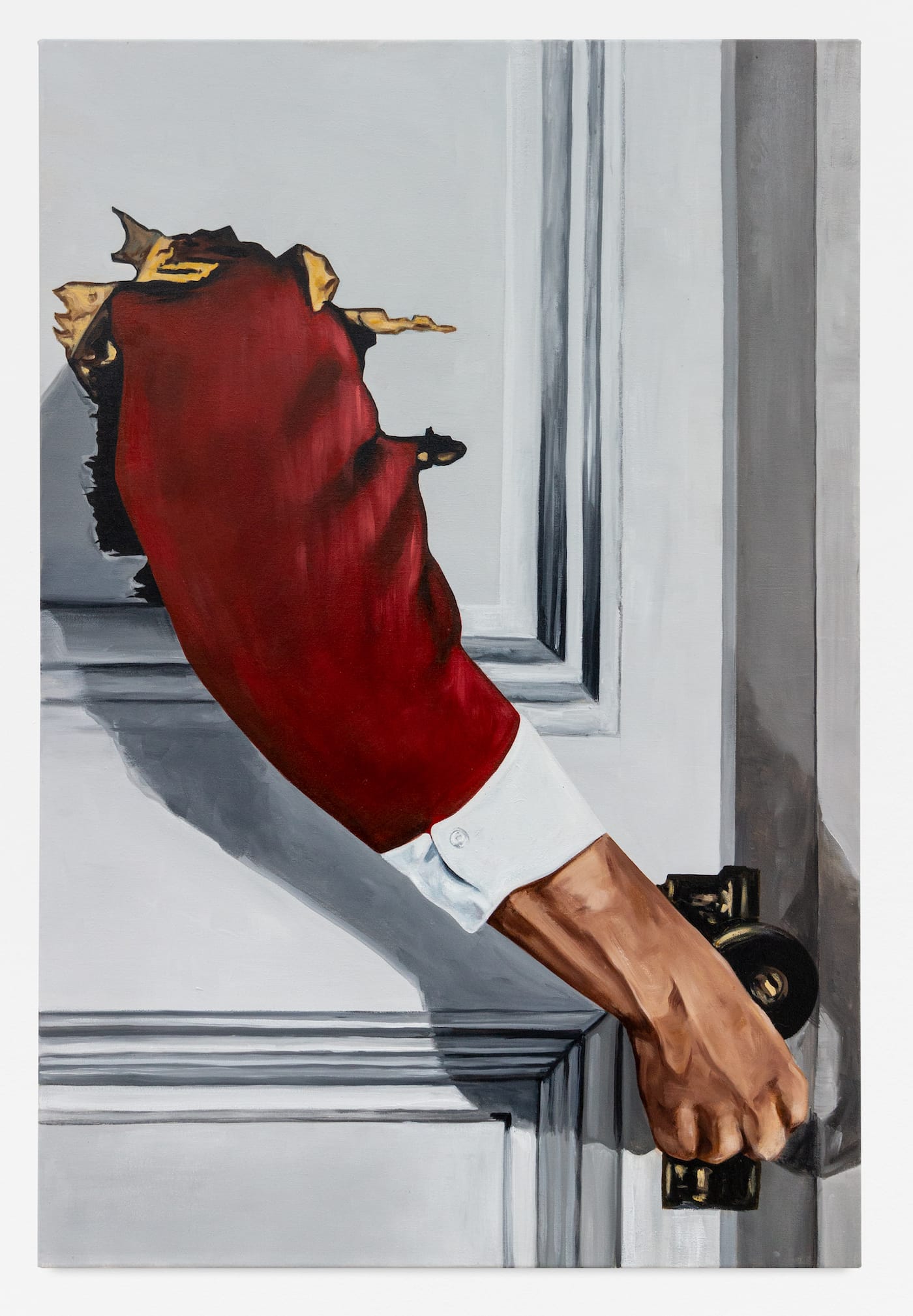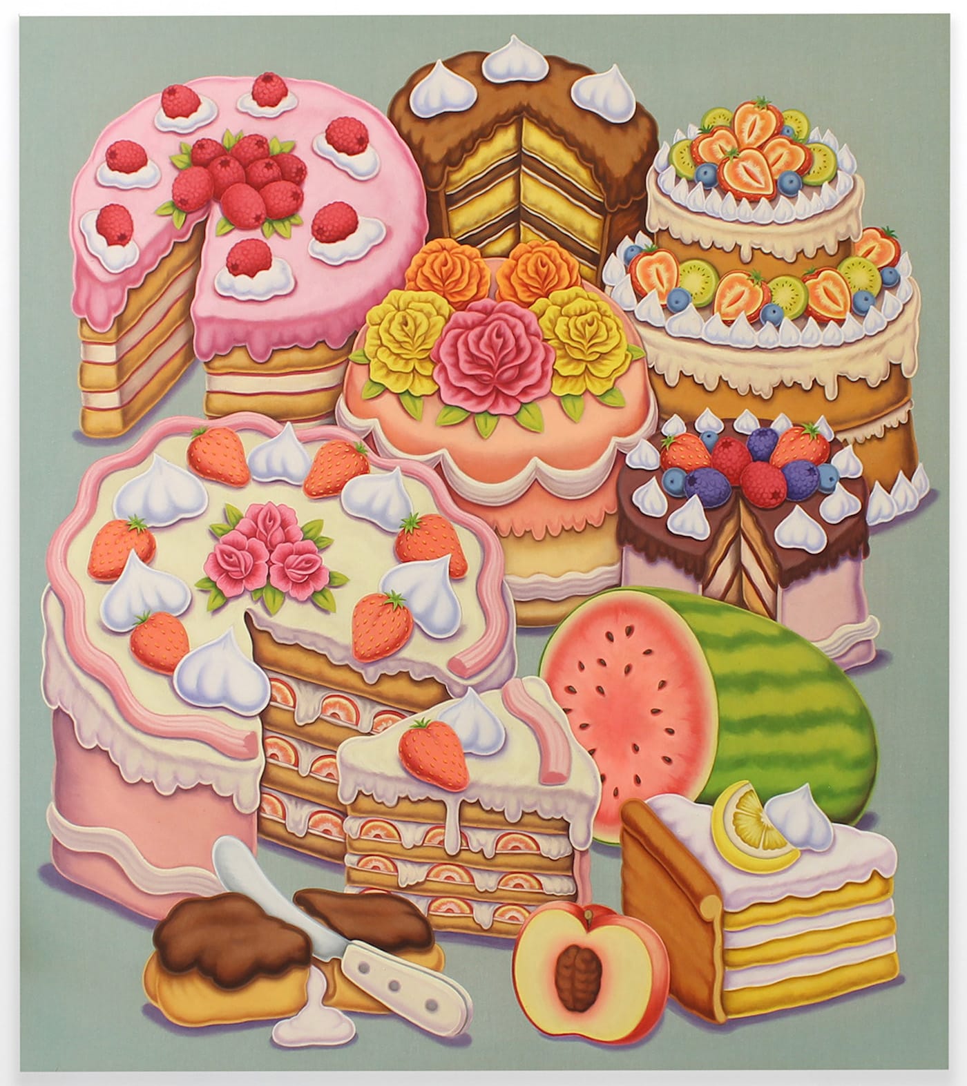 Pedro Pedro creates sumptuous still lives that capture the unsettling binary of abundance and despair that defines our contemporary moment. Like the Renaissance still lifes which they reference, Pedro’s paintings depict tables laden with flowers, fruit, meat, and cakes, however there is always a hint of decay, a watermelon rind, or fallen rose. His cartoonish, Pop-inflected style is at once exuberant and disquieting. All of these delights are flattened and pushed up against the picture plane in a Mannerist flourish, threatening to slide off the surface and out of our grasp.