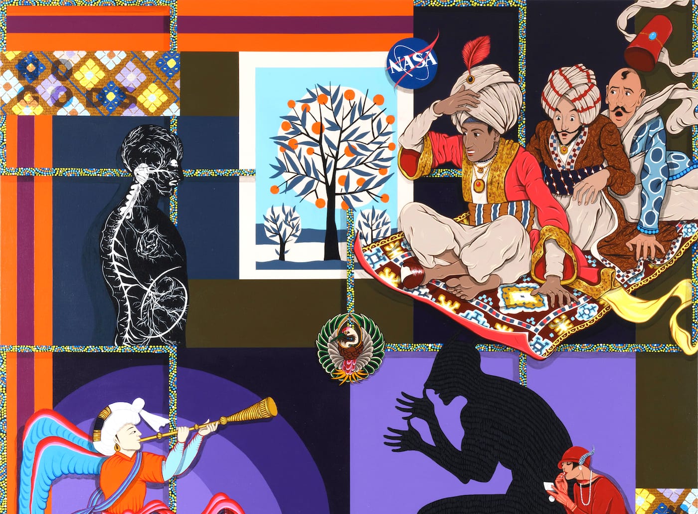 Amir Fallah draws on a rich mixture of sources, from Persian miniatures to children’s books, botanical illustrations, maps, and textile patterns to compose his vibrant, maximalist paintings. Born in Iran during the tumult of the Islamic Revolution, Fallah emigrated with his family to the US at age 7. He came of age in the punk and street art scenes of the 1990s, and co-founded seminal art and design publication Beautiful/Decay as a photocopied and stapled zine when he was just a teenager. The Fallacy of Borders, his first museum show in Los Angeles, presents painting, sculpture, stained glass, and printed matter that reflect his own experiences with migration, material culture, and multi-faceted identity.