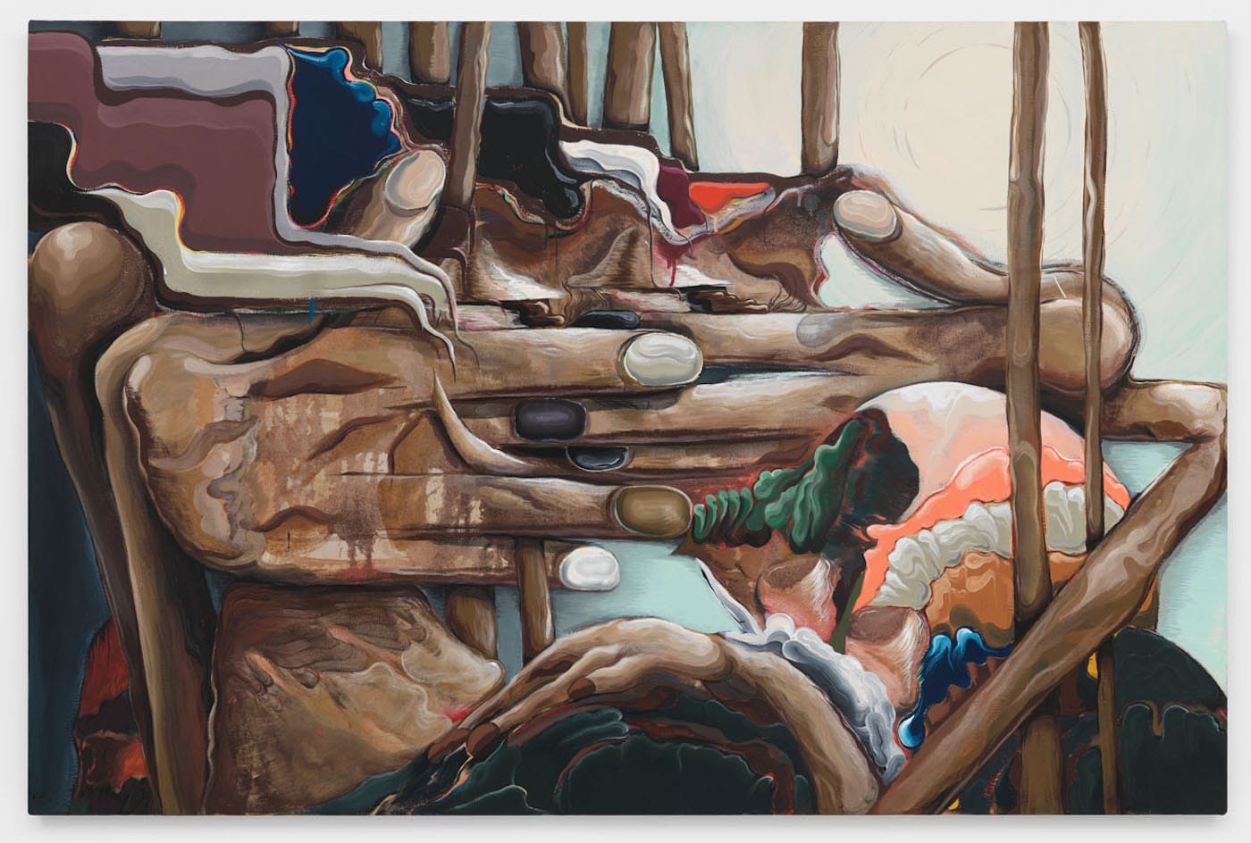 A sensory homunculus is a scientific figure of a human that illustrates how much of our brain is dedicated to controlling certain areas of the body. Its hand and mouth are monstrously oversized, given the exceptional neurological resources devoted to them. Bridget Mullen’s solo show at Shulamit Nazarian takes its name from the goblin-like creature, and her paintings elicit a similar sense of corporeal unease. With a nod to surrealism and psychedelia, she grapples with the tension between abstraction and figuration, as pools, blobs, and skeins of paint transform into body parts, hair, and effluvia. For both Mullen and the homunculus, representation is not limited to the visually mimetic.