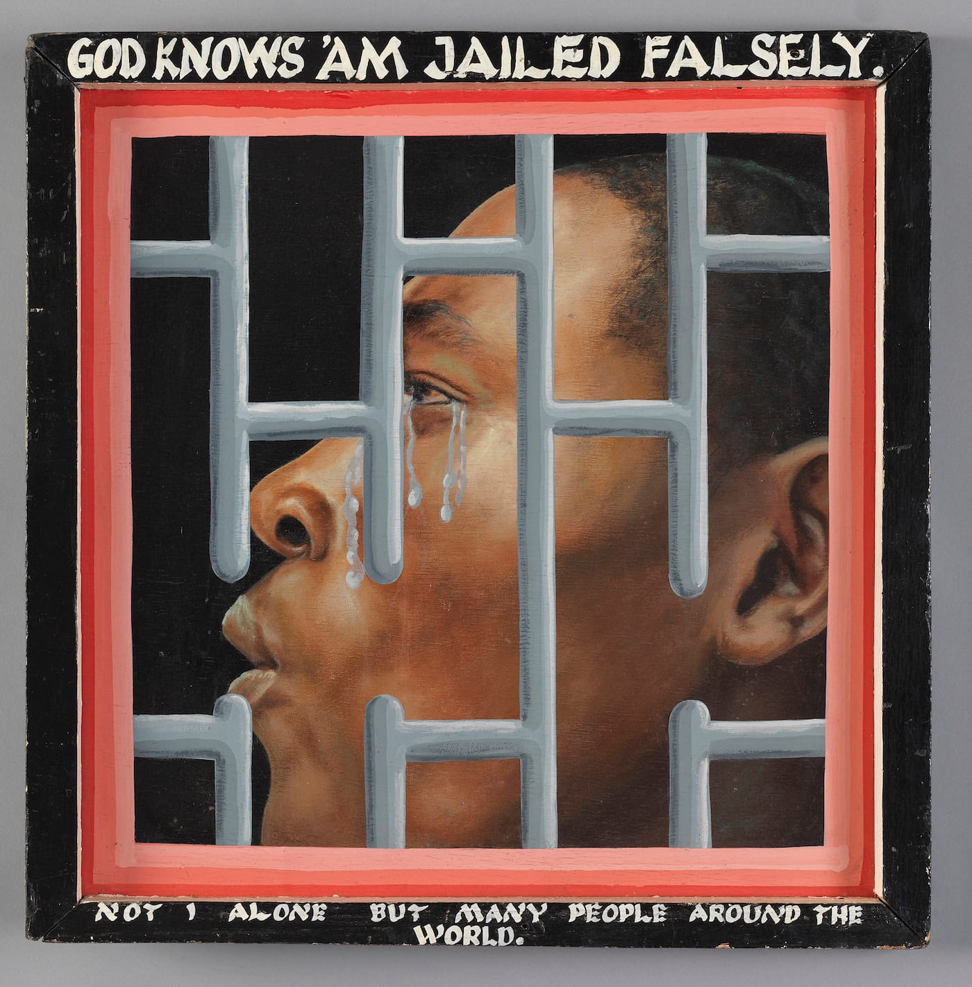 Kwame Akoto, known as “Almighty,” established his studio, Almighty God Art Works, in the Ghanaian city of Kumasi 50 years ago. He began painting signs for businesses and religious banners for local clients, before shifting to “creativity arts,” paintings created for international collectors that incorporate text rendered in his signature sign-lettering. Ranging from portraiture to commentaries on contemporary global issues, Akoto’s paintings are firmly embedded in the tradition of Akan arts of Southern Ghana, while transcending a specific utilitarian function.