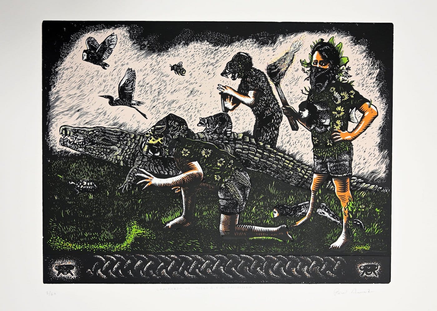 Pavel Acevedo’s intricately carved linocut prints depict nahuales of Mezoamerican mythology — people with the ability to shapeshift into animals — confronting contemporary issues surrounding migration and identity. In one print, a half-raccoon, half-human holds a sign stating “When we fight, we Win,” while in another, a hybrid bat figure bears a slogan reading “Somos Millones, Cuentanos Bien” (We Are Millions, Count Us). The Shell in the Clouds (El caparazón en las nubes) is the culminating show of the Oaxacan-born, Riverside-based artist’s “Beyond the Press” residency at Self Help Graphics, which began in early 2020. It features prints created during the residency, as well as the linoleum blocks from which they were printed, offering insights into his process.