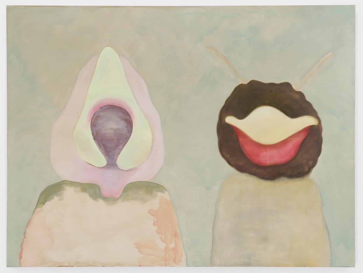 Tomoo Gokita’s first solo show with Blum & Poe in 2018 featured black and white paintings of figures pulled from print media that he alters and distorts with unsettling results. For his second solo show, the Japanese-born artist brings color back into his work and has abandoned the print sources, relying only on his imagination. These new paintings walk a line between abstraction and figuration, straddling high and low art with references to B-movie monsters as well as surrealistic predecessors like de Chirico or Dalí.