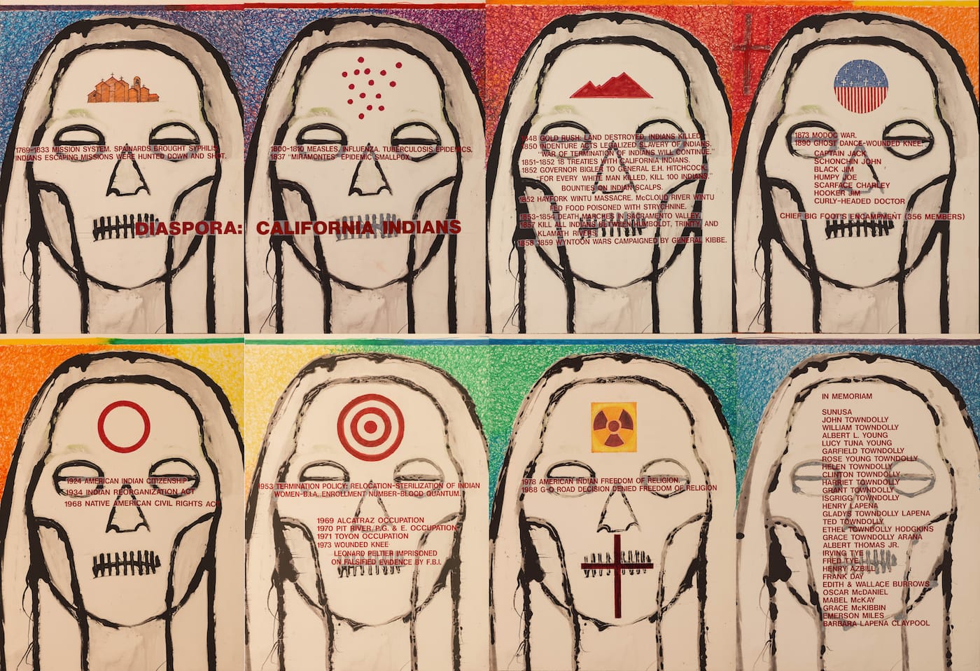 When I Remember I See Red is a group exhibition of Native American artists in California whose work is both a celebration of their heritage and a form of cultural resistance. Spanning 50 years — dating back to the occupation of Alcatraz in 1969, a key moment in the American Indian Movement — the exhibition is divided into sections focused on “Native Knowledge,” “California’s Genocide,” and a recognition that “You Are On Native Land.” The show was conceived by the late Nomtipom Wintu artist Frank LaPena, and features a section dedicated to his influential legacy.