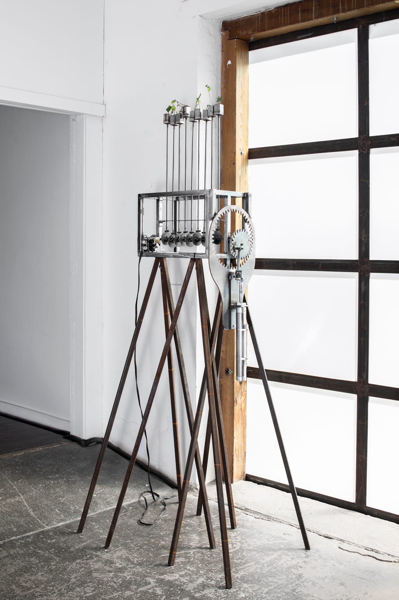 The significance of breathing — both as the basis of life, but also as a pathway for disease — has been magnified since the appearance of coronavirus earlier this year. With their two person-exhibition Becoming Atmosphere, Beatriz Cortez and Kang Seung Lee consider breath, air, and atmosphere with a wide lens as they pertain to ecological, cultural, and political concerns. The show features an array of work, including Lee’s drawings of vaporous figures in front of the Hollywood sign and Twin Towers (after Tseng Kwong Chi’s iconic photos), and Cortez’s Tinguely-like sculpture of piston-driven plants.