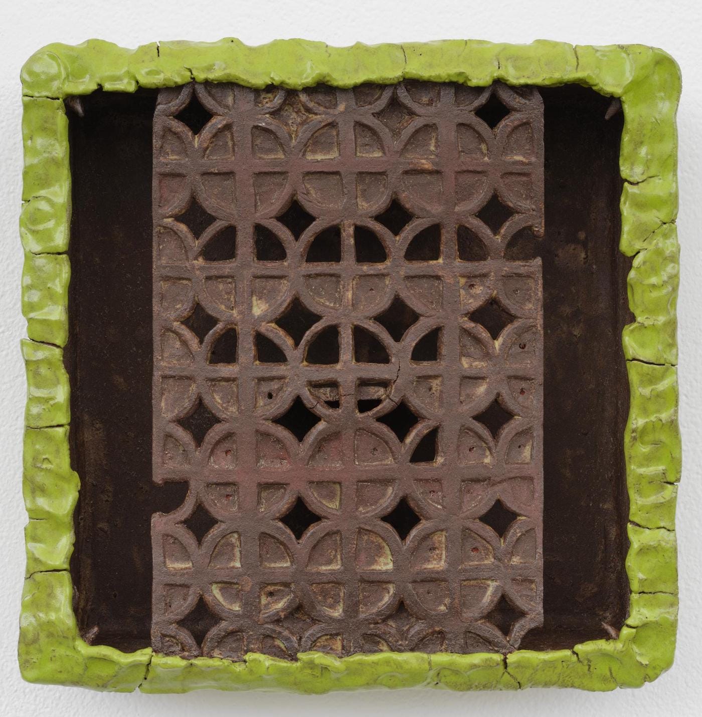 Lizette Hernandez’s ceramics toe the line between seeming familiar and alien, encouraging prolonged viewing. The deftly crafted wall works and free-standing sculptures incorporate Mexican religious design motifs but stretch these references into formal abstractions, glazed in bright green against the deep brown clay. Finger marks are left visible, signs of human touch amidst their exquisite construction.