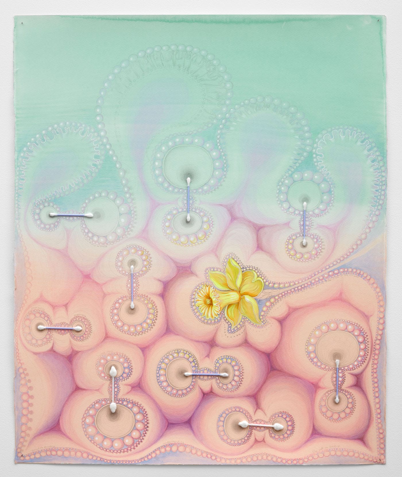 Curated by artist Lucy Bull, Emblazoned World features works loosely strung together by intimacy, idiosyncrasy, and “an affinity for feeling over logic,” as the press release states. Named after a 1969 drawing by Lee Mullican, the show features work by Mullican as well as his late widow, Luchita Hurtado, who is represented by one of her “moth light” paintings from 1975, meant to attract the insects through entrancing luminosity. Other works include crucifixion sculptures incorporating repurposed bikinis by Elizabeth Englander, biomorphic carved wooden stools by Nik Gelormino, and sensuous abstract paintings by Kinke Kooi.