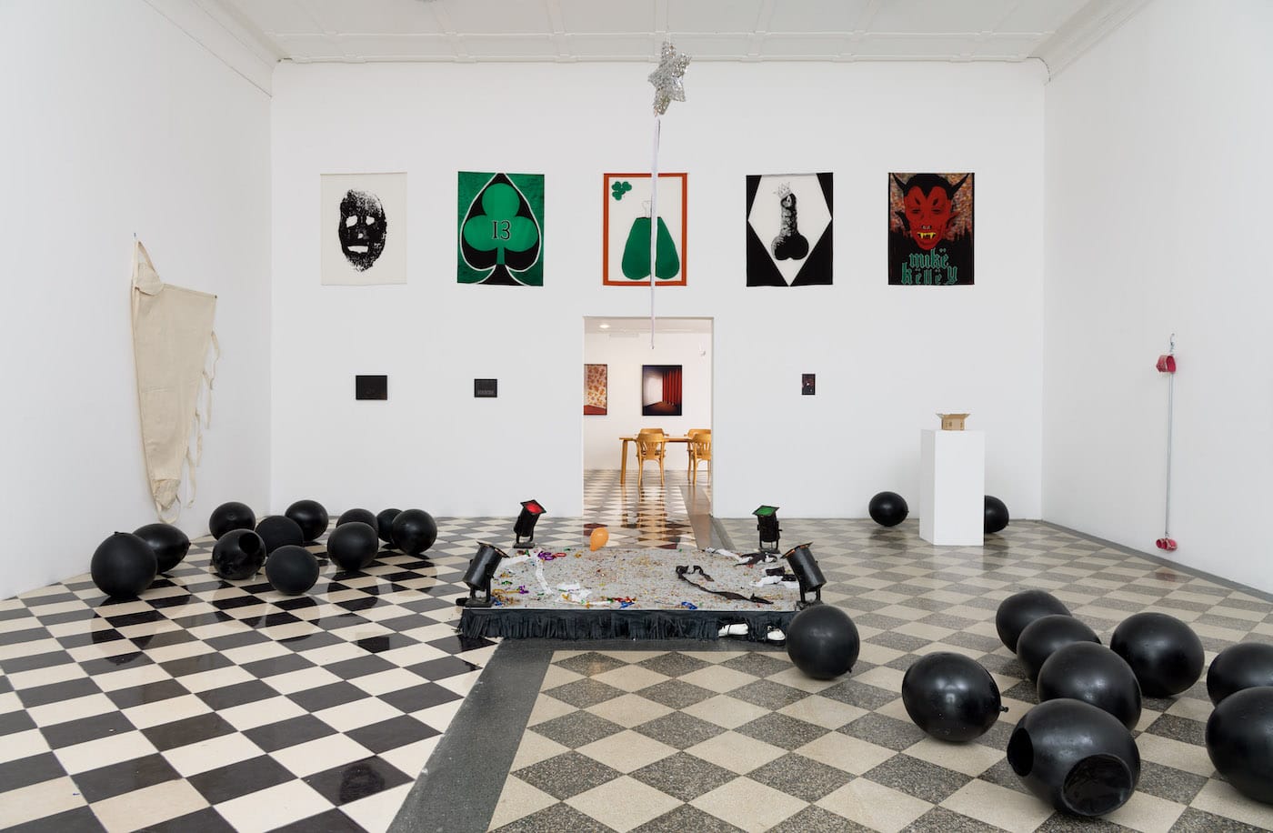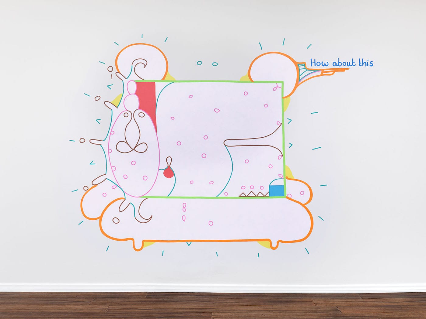 Lily van der Stokker’s wall drawings toe the line between hard-edge formalism and soft, playful abstraction. Since the 1980s, she has been exploring organic forms, bright colors, and text fragments in works that keep one guessing. She revisits and remakes several of her drawings originally created in the 1990s in What Is it, rebuffing the works’ apparent spontaneity with years of research and revision.