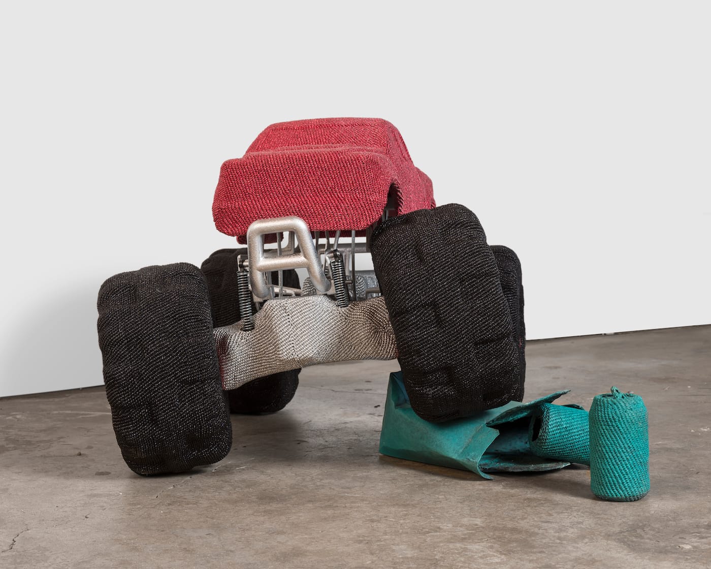 With material virtuosity and subversive humor, Luis Flores’s hand-crocheted sculptures challenge assumptions about fine art, craft, and stereotypes of masculinity. He often focuses on his own body, crocheting eerily lifelike, full-size stand-ins that practice amateur wrestling moves or flex with puffed-up bravado. In Because of You, In Spite of You, Flores reflects on his own life as a young father, staging a Monster Truck rally out of yarn and bronze epitomizing the glee and panic of early parenthood.
