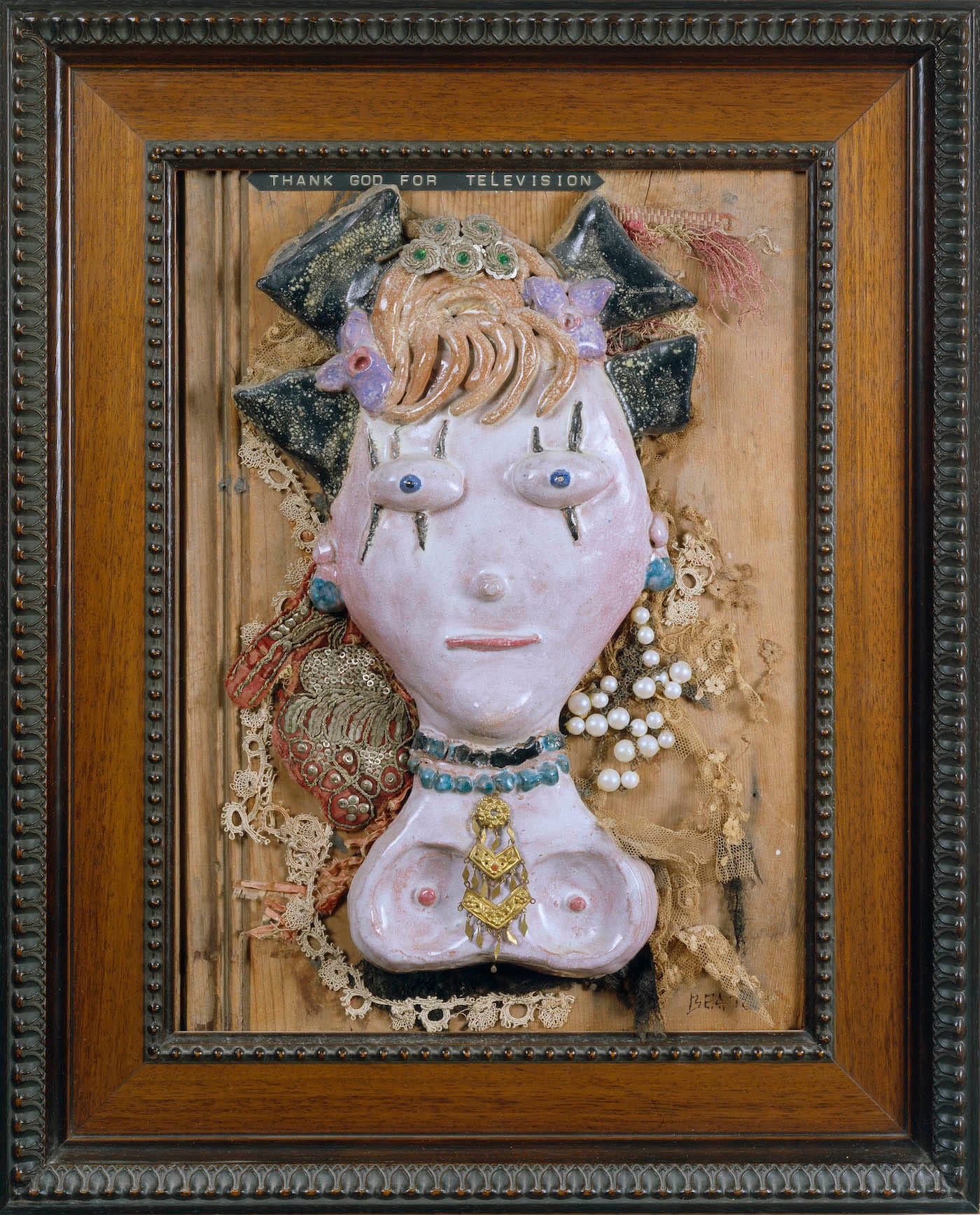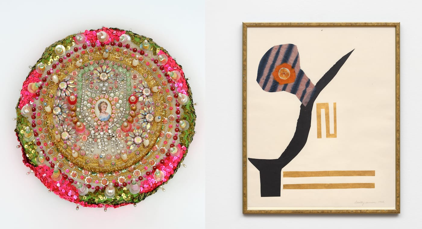 Dorothy Iannone was born in Boston but has spent much of her peripatetic career in Europe, living in Iceland, Switzerland, London, and Berlin. Beginning in 1959 and continuing for over three decades, Iannone’s mother, Sarah Pucci, would send her daughter small sculptures she crafted from beads, sequins, and foam — homespun baroque assemblages to keep her company on her travels. This show at Hannah Hoffman pairs 15 sculptures by Pucci with 4 collages that Iannone made on a 1962 trip to Japan, and a 1980 video about her mother, drawing connections between the formal and familial.
