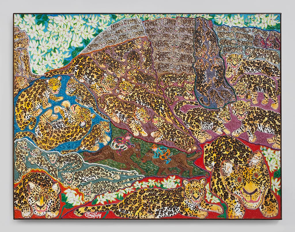 Parker Gallery opens its fall season with solo shows from two quite different but equally exuberant artists. Maija Peeples Bright: beautiFOAL is a career-spanning retrospective of the work of this seminal Funk and Nut artist, covering nearly six decades of eye-popping paintings and sculptures filled with a veritable ark of beasts. Fuck the King’s Horses and All the King’s Men is LA-based artist Troy Chew’s first solo show with the gallery, showcasing his detailed, blinged-out paintings that connected hip-hop aesthetics to earlier historical precedents.