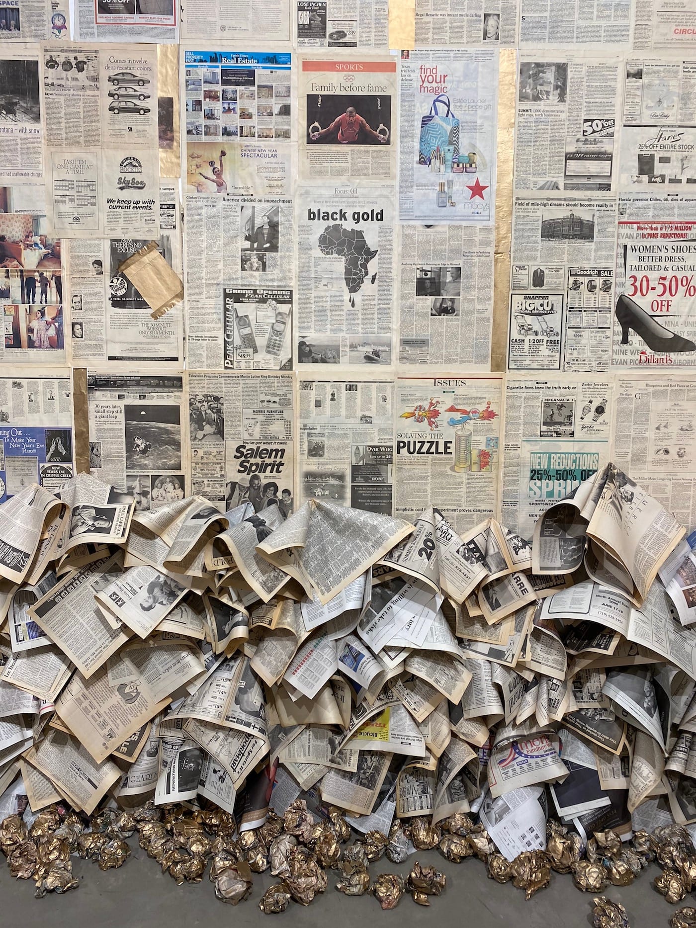 Visitors who are only familiar with Senga Nengudi’s post-minimalist stretched stocking works will be in for a nice surprise. Her first solo LA gallery show in over 40 years features two large-scale installations: “Sandmining B” (2020), a field of sand punctuated by mounds of bright pigment and scattered debris, and “Bulemia” (1988/2018), a room whose walls are covered in newspaper pages, which Nengudi has altered with gold paint. In doing so, she turns bleak headlines into messages of Black resilience and achievement, offering a utopian vision that is still very much in need of amplifying.