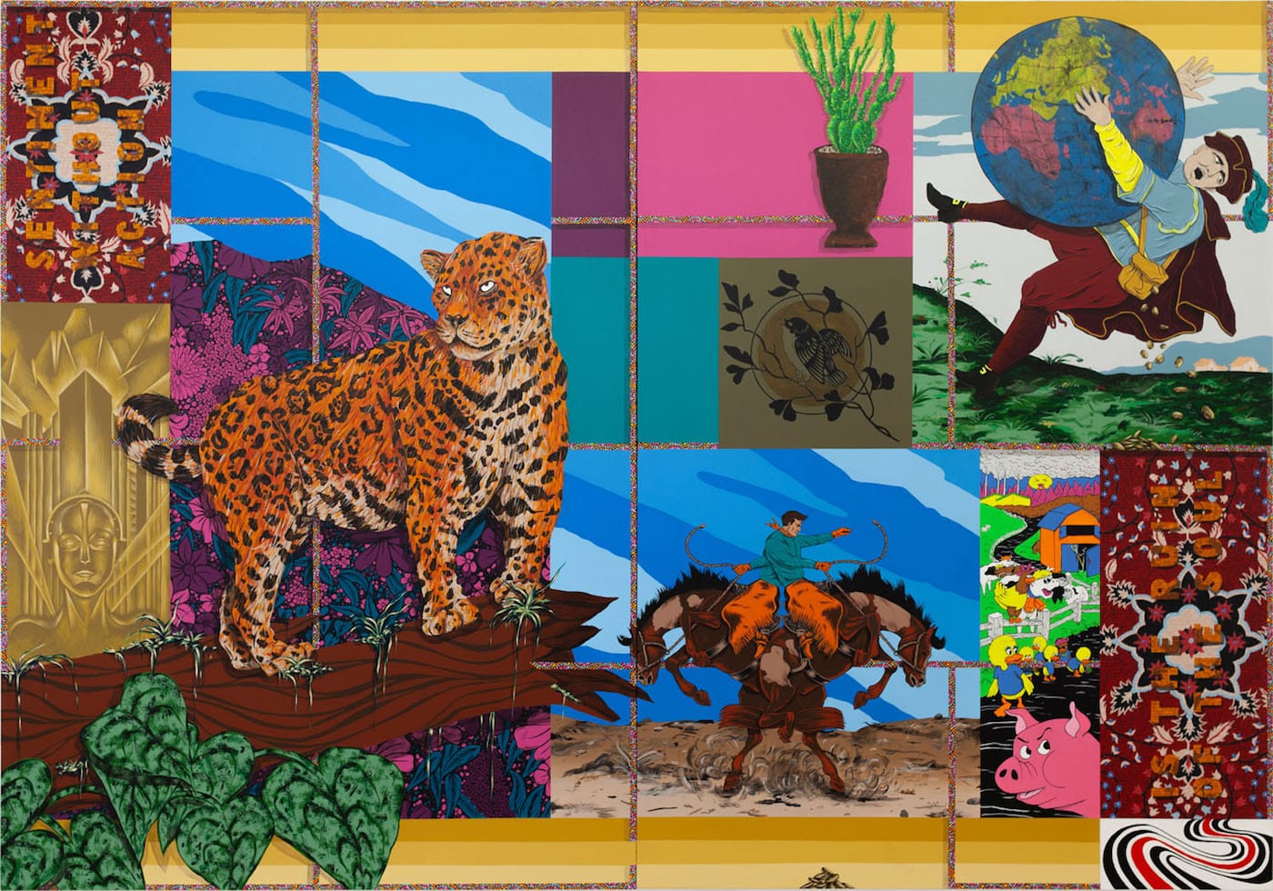 Amir Fallah’s paintings have proposed a new approach to portraiture, shrouding figures in layers of heavily patterned fabrics, surrounded by evocative objects. With his new show at Shulamit Nazarian, Remember My Child…, the artist goes one step further, removing the figure completely, and drawing on myriad pictorial sources to form composite portraits: his child’s picture books, punk logos, world maps, and Persian miniatures, among others. Each canvas can be viewed as a coded iconographic parable or lesson from the artist to his young son, bridging generations and geography to form a fractured yet enticing visual language.