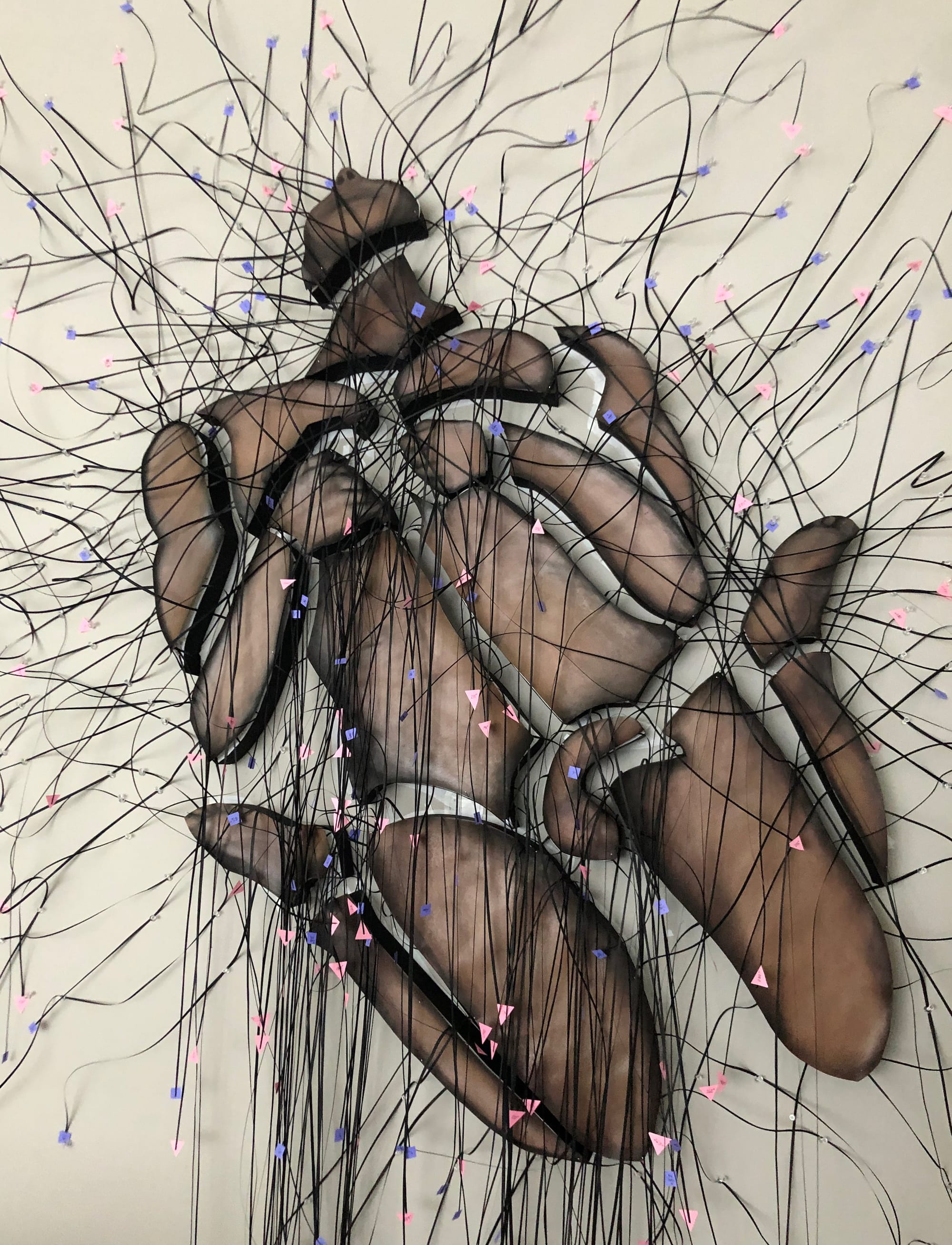 Mind Heart Rectum reflects Enrique Castrejon’s personal struggle with his father’s cognitive and physical decline. The exhibition features six monumental sculptures of Black and brown male bodies, fractured into geometric forms. Castrejon then measures these shapes and records these measurements at the ends of black strips of paper that criss-cross the sculptures like tangles of wires, alluding to the failure of logic to solve some of life’s biggest mysteries.