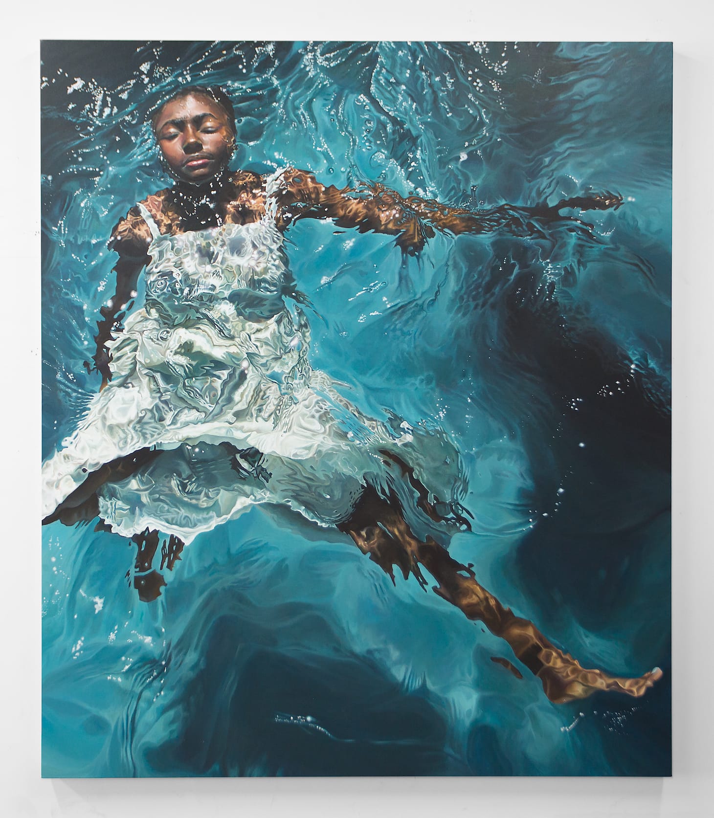 The historical and symbolic relationship between water and Black bodies is the focus of recent paintings by Calida Rawles, whose work was featured last year as the cover image for author Ta-Nehisi Coates’s novel The Water Dancer. This solo exhibition carries on this theme of water.