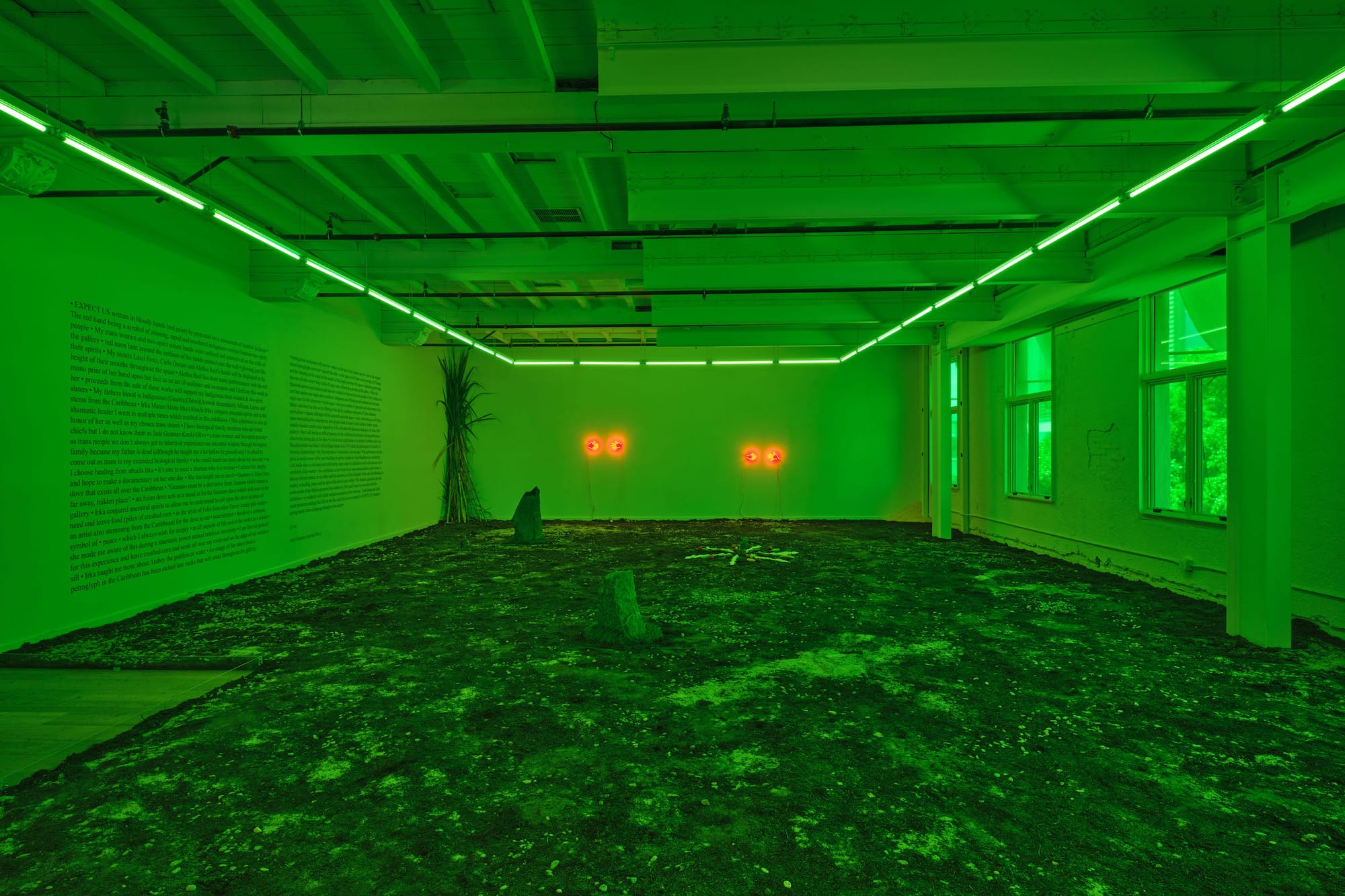 Though the exhibition may seem cryptic at first — with ceremonial offerings arranged on the ground, a stream-of-consciousness artist statement overtaking an entire wall, and the green-lit gallery installation suffused with the overwhelming smell of earth — Puppies Puppies (Jade Guanaro Kuriki-Olivo) is surprisingly direct, and vulnerable. Here, the trans artist sheds some of the mechanisms of distance like the sexiness, humor, and critique that characterized so much of her work under the moniker of Puppies Puppies to reveal more of herself as Jade Guanaro Kuriki-Olivo.