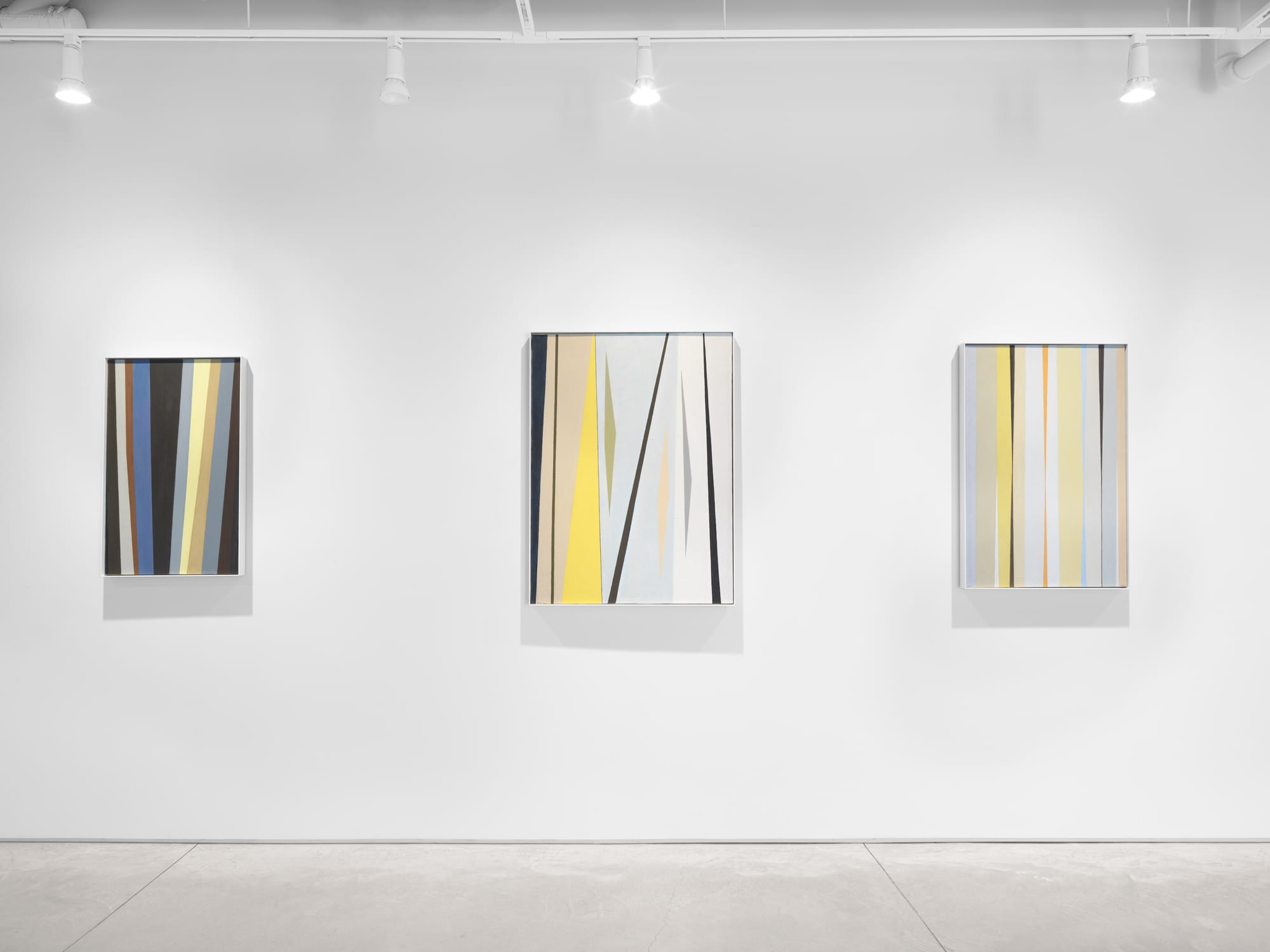 Alice Trumbull Mason, a painter, printmaker, and vocal proponent of non-objective art who cofounded the American Abstract Artists group in 1936, is among the figures who are getting their due with the reevaluation of the prevailing — typically white, male — narrative of American abstraction. Titled after a phrase from Will Heinrich’s contribution to a Mason monograph published last year, Shutter Paintings features 16 mature paintings made between 1960 and 1966 that are characterized by hard geometric ribbons of color running vertically, sometimes askant, down the canvas.