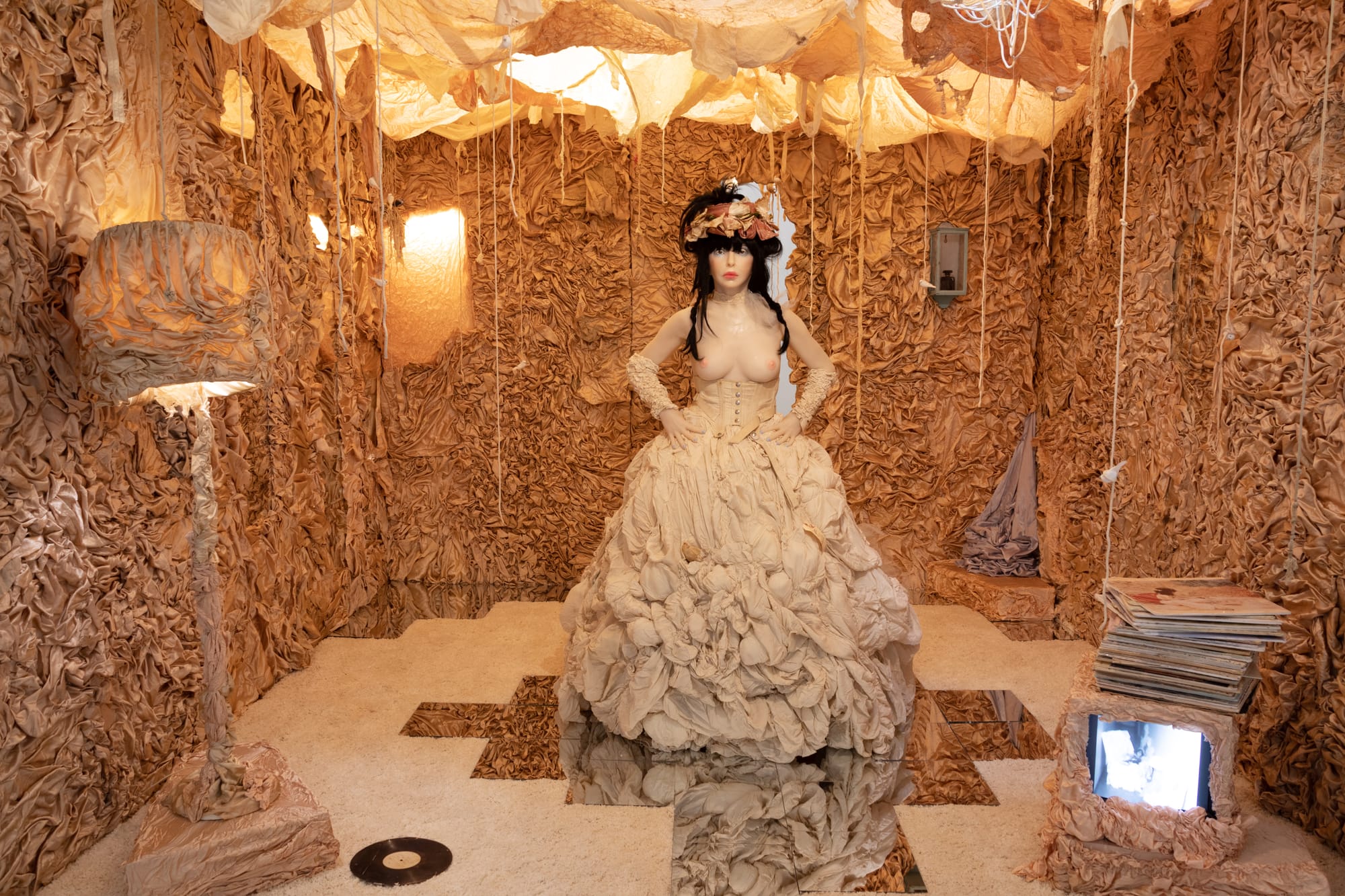 The fabulous, ever-evolving transdisciplinary artist Colette Lumiere, who “died” at the Whitney in 1978 and was reborn as the executor of her estate and a no-wave musician at MoMA PS1 several days later, is the subject of this immersive, media-spanning exhibition at Company. Check out a reconstructed portion of the Tunisian-born, New York-based artist’s “Living Environment” (1972-1983), the downtown Manhattan loft that she turned into a “grotto of fantasy” — with herself, a living sculpture, at its center — using ruched satin, light boxes, mirrors, ropes, and more.