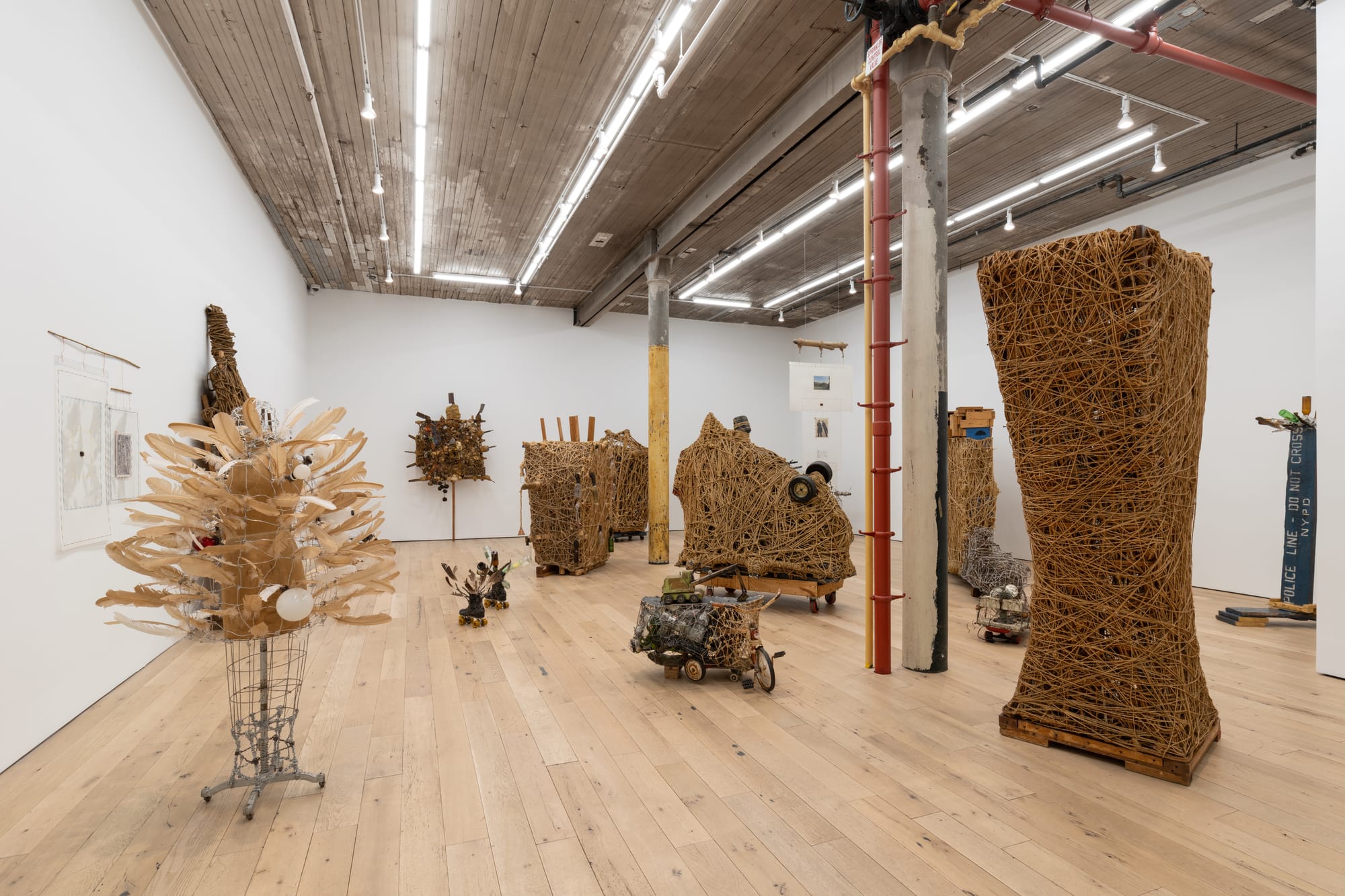 Jamaica-born, New York-based artist Arthur Simms presents three decades’ worth of drawing and sculpture engaging with his longstanding exploration of his diasporic identity as well as his work at the intersection of folk art, craft, and art history. Found object assemblages feature twine or wire lattices that wrap and bind disparate items including roller skates, rocking horses, feathers, and, in the case of one piece inspired by Willem de Kooning and Marcel Duchamp, two bicycles with a vintage toilet; relatively two-dimensional works cobble together materials including tinfoil, photographs, hair, and acetate.