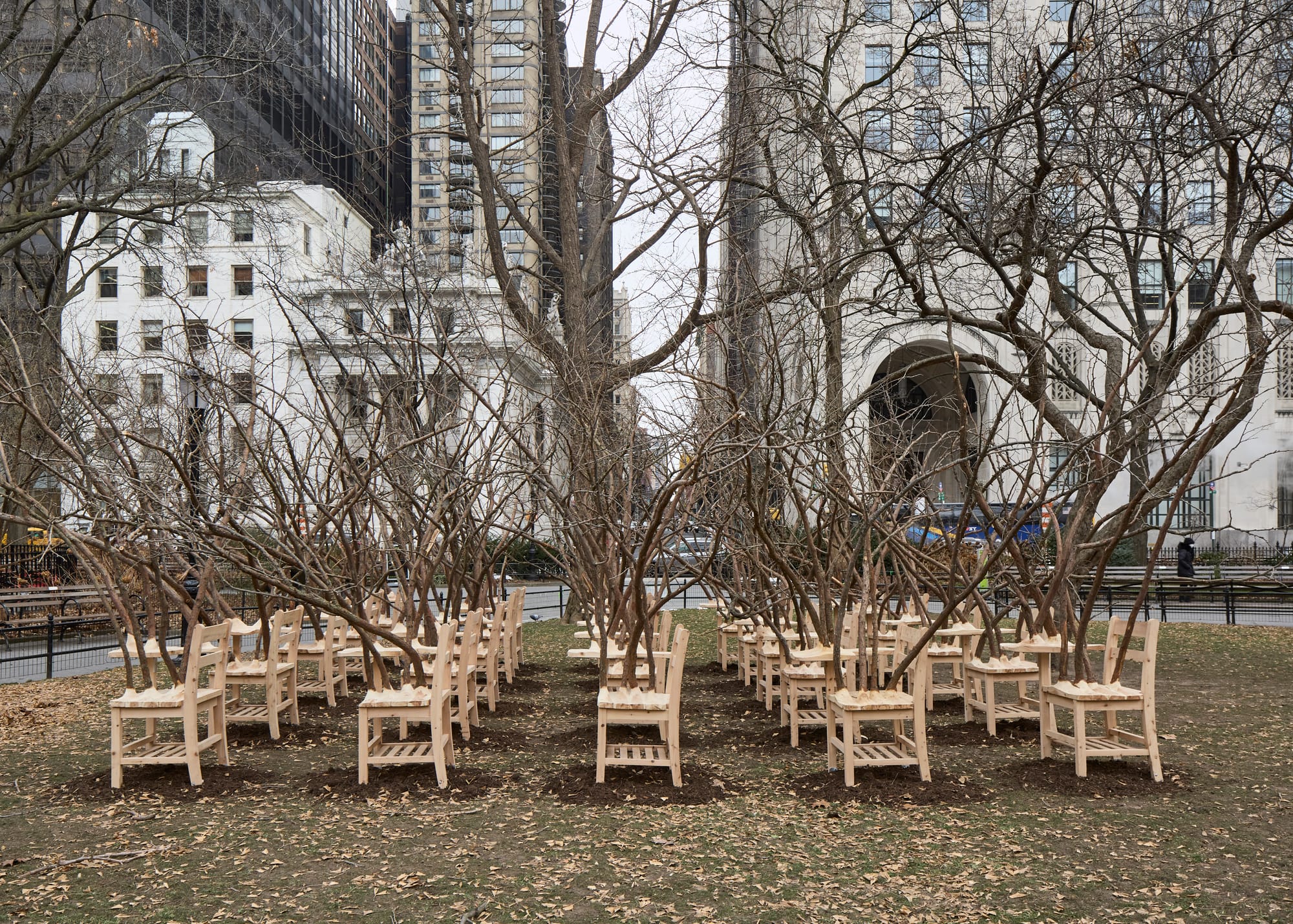 Overtaking four lawns of Madison Square Park, Hugh Hayden's ambitious sculptural installation features 100 wooden elementary school task chairs rendered unusable by the bare tree branches that aggressively sprout from them. Contemplating inequity in the American education system, Hayden's Surrealist twist on vernacular classroom furniture depicts institutionalized learning as a thicket that is structurally uninviting, exclusionary, and absurd.
