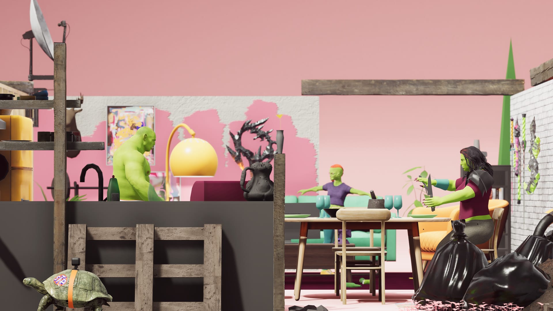 “The feeling of presence: this is the defining quality of the metaverse,” a voice flatly tells us, borrowing some of Mark Zuckerberg's vacant techno-utopic utterances. Among the highlights of Athens-born, Los Angeles-based artist Theo Triantafyllidis’s solo show are two video installations that connect contemporary feelings of alienation with the radicalization pipeline: one simulation depicts bored Orks on their electronic devices amid storms and kitchen fires, while the other features a violent clash of figures, some of whom carry white nationalist flags.