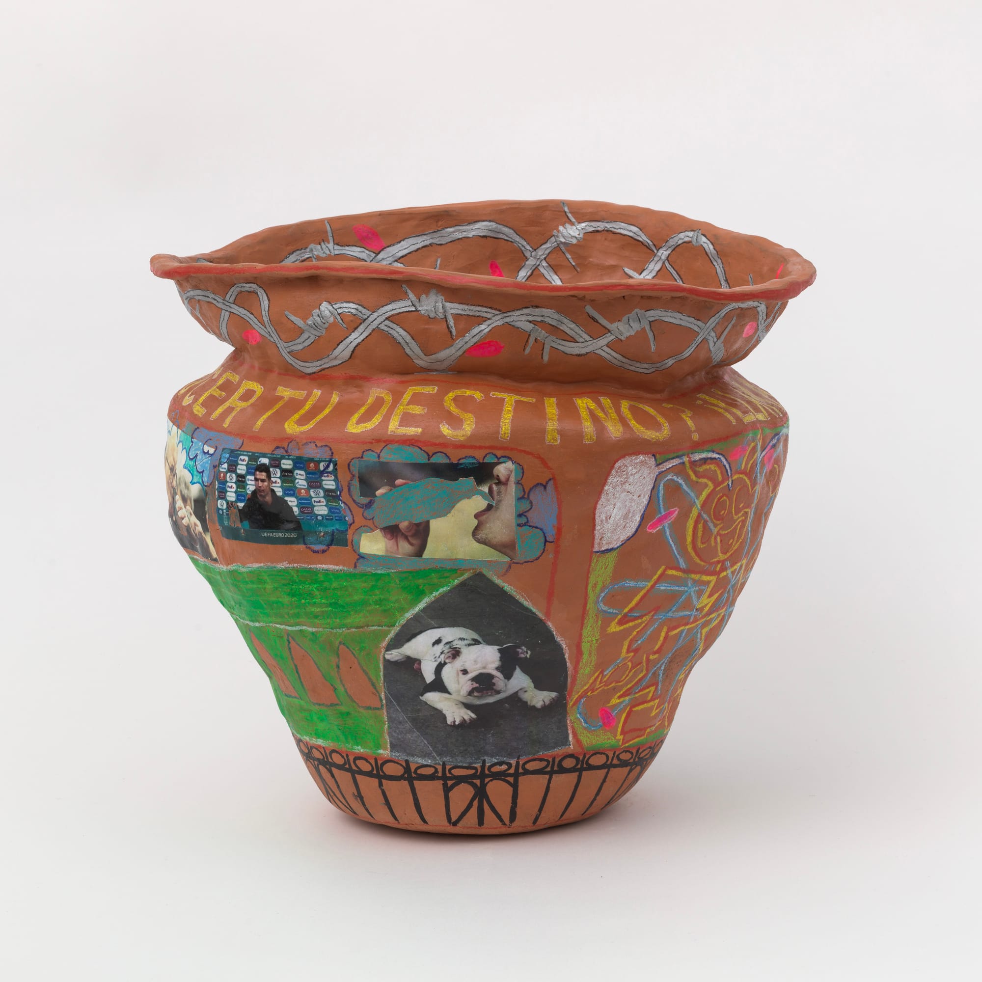 What do you think you are, the last Coca Cola in the desert? My friends and I grew up with this sassy Spanish idiom, invoked in cases when someone thinks they’re cooler than they really are. It’s the perfect title for this deliciously irreverent exhibition at Rachel Uffner Gallery, which pairs Tyler Lafreniere’s silkscreen and hand-painted acrylic works with Manuel Mendoza Sánchez’s ceramics and wooden sculptures. Lafreniere’s paintings lampoon societal and gender archetypes through cheeky pop-culture references (a Playboy magazine cover, a “Gas, Grass, or Ass” bumper sticker), while Sánchez’s objects feature fantastic amalgamations of creatures, palm trees, Perrier bottles, and disgraced business magnates (pictured in one work: Warren Buffett with a case of Coca-Colas in the desert). — VD