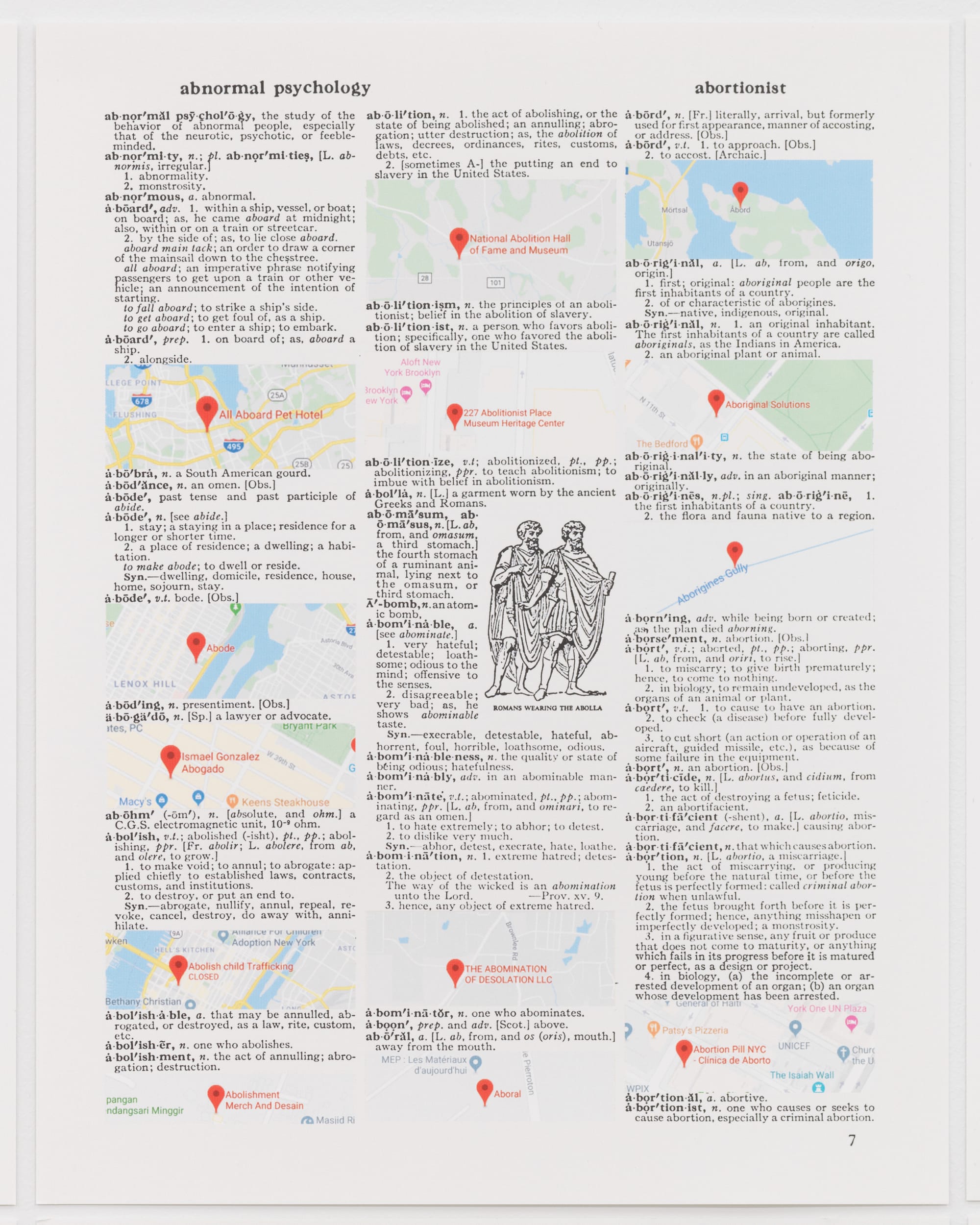 Luis Camnitzer’s latest Alexander Gray exhibition breaks with algorithmic authority. A longtime critic of big tech, Camnitzer now traces the development of his reasoning from works made in the 1960s to the present. Arbitrary Order centers his new A to Cosmopolite series, in which a vast annotated dictionary comes to life through Google Maps coordinates. Words like “arrest” and “addict” do not correlate to the government agencies enforcing criminalization, but rather to innocuous Long Island businesses around his home, such as “Hair Addict.” In this way, Arbitrary Order condemns artificial intelligence’s inability to grasp political nuance or replicate meaning. — Billie Anania