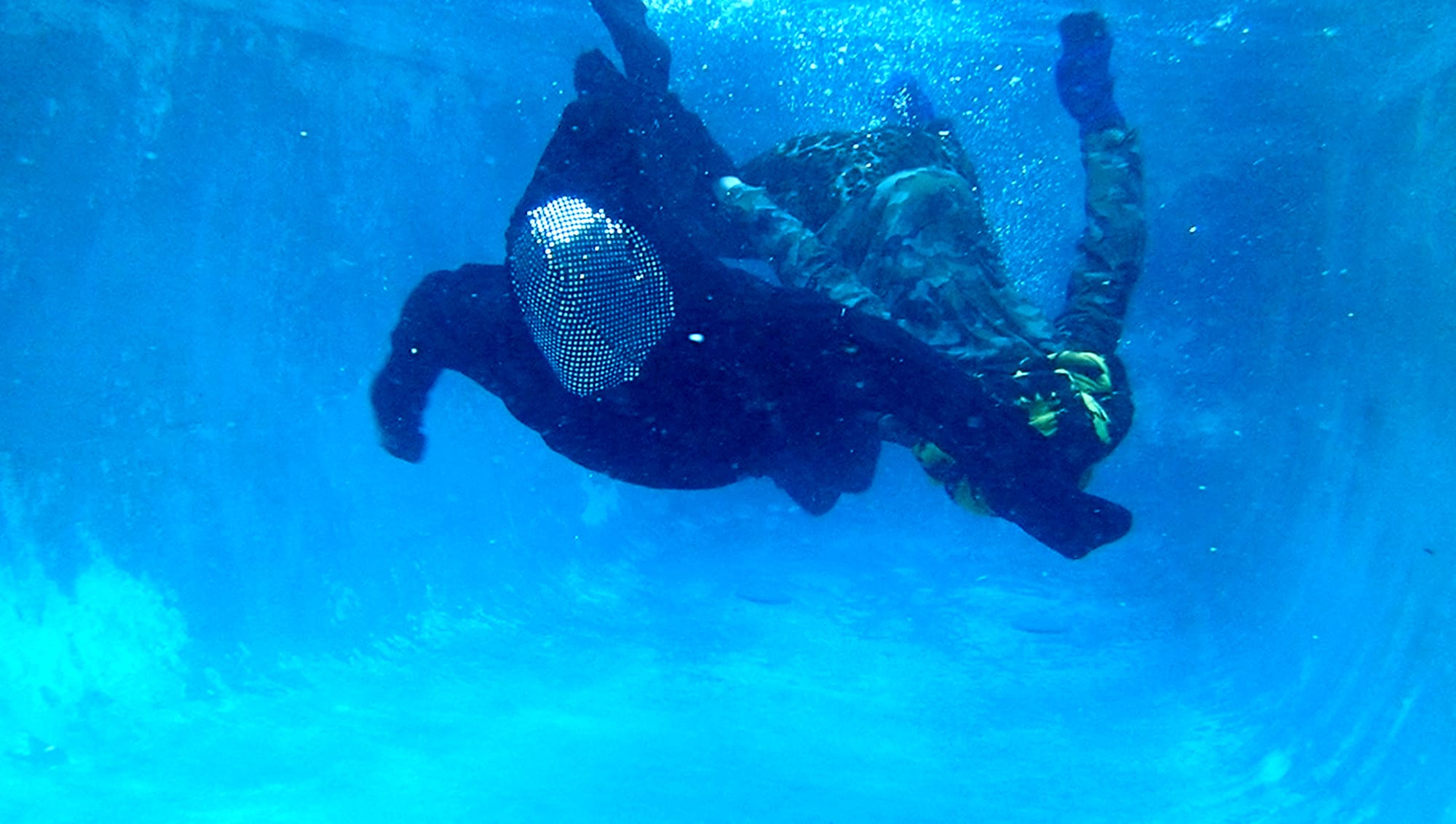 Los Angeles-based multimedia artist Suné Woods's five-channel video installation “Aragonite Stars” (2021) immerses viewers in waterscapes populated by humans that swim in non-anthropocentric ways, drawing connections between marine ecology, Black feminist thought, and water’s spiritual and curative properties. Expanding upon an earlier version of the work that debuted at the Hammer Museum’s 2018 exhibition Made in L.A., this iteration features a new sound installation by Meshell Ndegeocello.