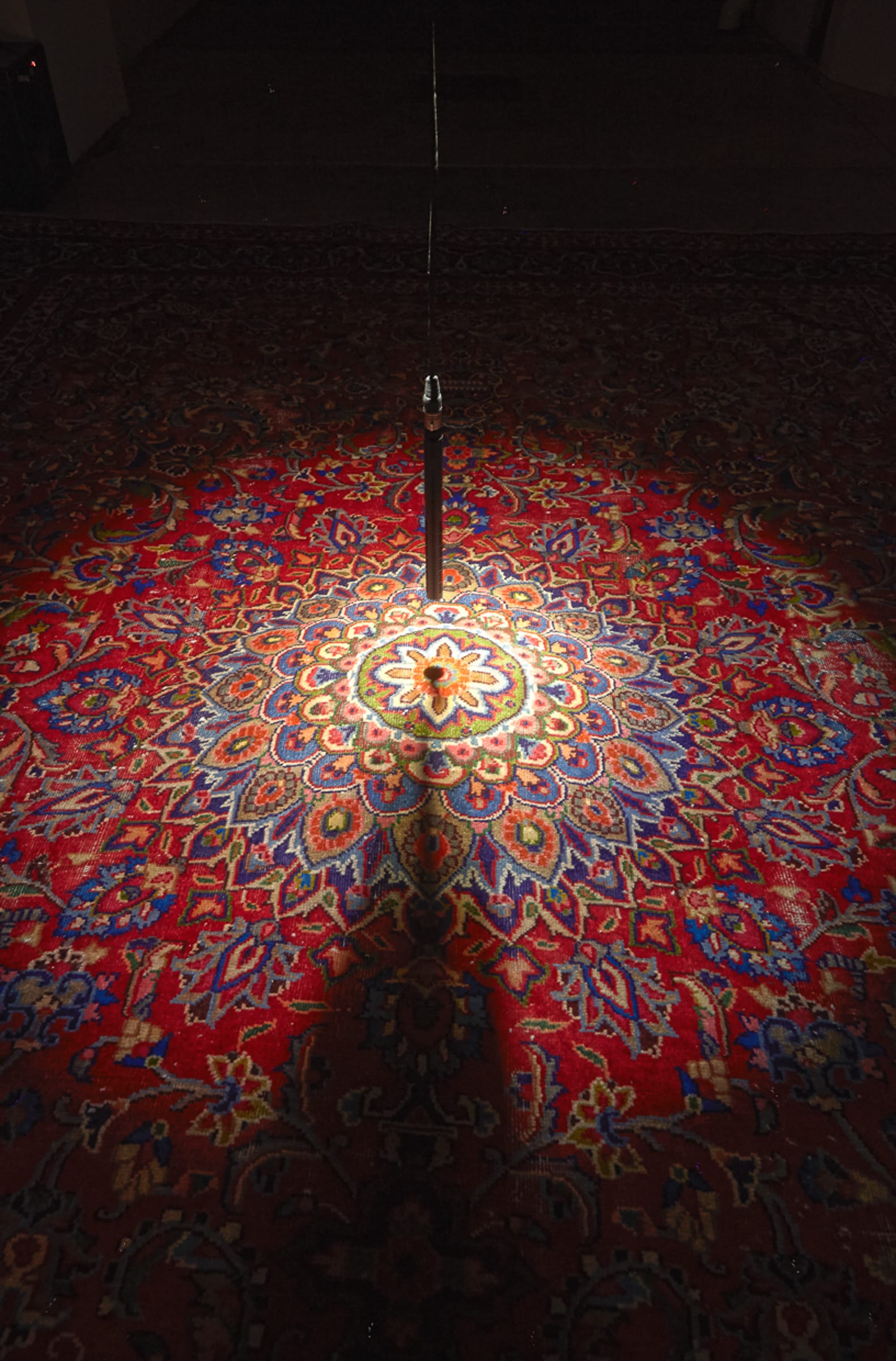 Iranian-American interdisciplinary artist Sholeh Asgary, the winner of TSA New York’s 2021 Open Call, presents video, prints, and installation at the intimate and fluid nexus of sound, water, and body. In an interactive sound piece titled “Qanat” after an ancient Iranian underground aqueduct, gallery-goers can experiment with moving their bodies to modify the amplified sounds that emanate from a traditional rug with radial symmetry symbolizing a fountain.